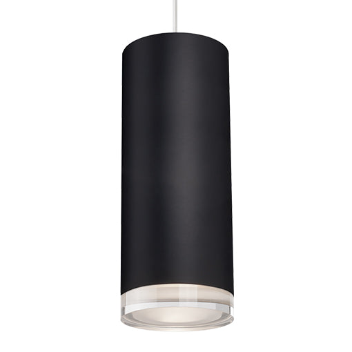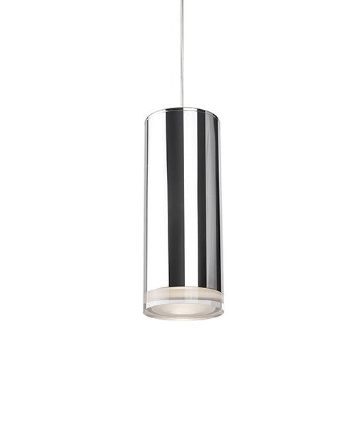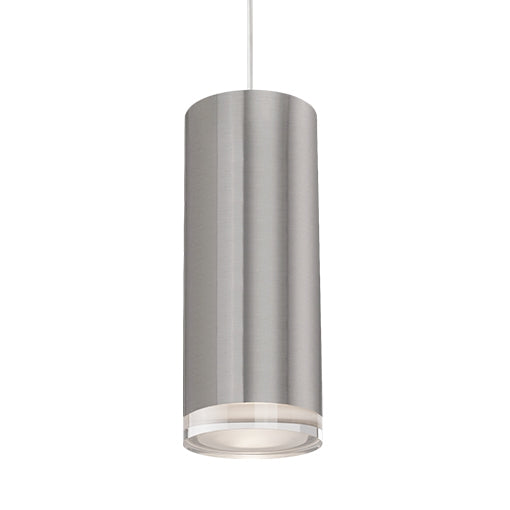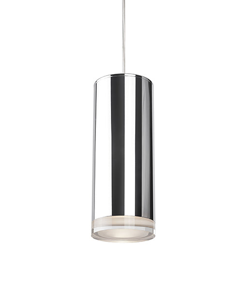 Pendentif en forme de cylindre à LED unique avec disque en cristal clair. Équipé de notre puissante technologie LED 120V AC, avec des détails métalliques en finition blanche, noire, nickel brossé ou chrome. La verrière ronde correspond à la finition choisie.