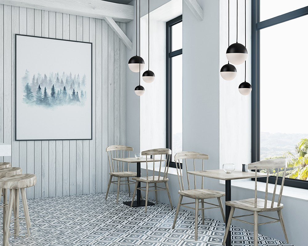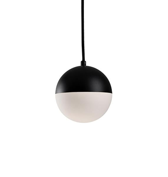 Pendentif unique en forme d'orbite de style rétro LED. La demi sphère supérieure est en métal noir peint, le bas de la sphere est en verre opale blanc. Lorsqu'elle est allumée, la lumière brille uniformément dans la vitre inférieure et dans la zone environnante. Ajustable à un maximum de 72 "avec un câble SVT couvert de tissu noir. La source d'éclairage est du Del intégré de 8W, entièrement graduable, avec un gradateur électronique bas voltage. Disponible en trois tailles différentes, 6 pouces, 8 pouces et 10 pouces.