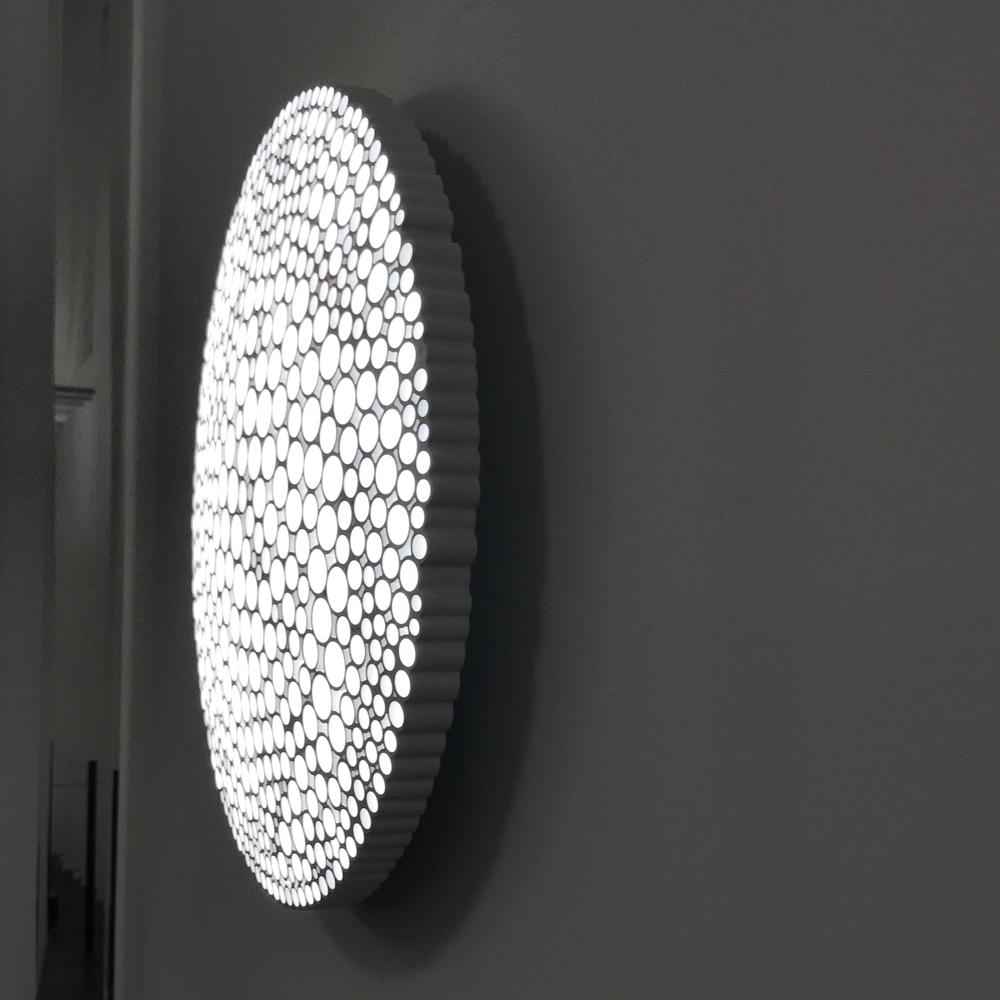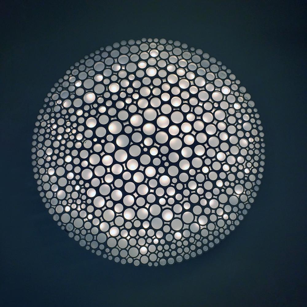 Le diffuseur est construit à partir d'une forme organique en nid d'abeille composé de tubes de différents diamètres, disposés dans une géométrie aléatoire. Non seulement il est visuellement agréable, mais il fournit également une émission directe et confortable de la lumière. Le résultat est un objet d'éclairage très émotionnel qui unit avec intelligence son esthétisme et sa qualité d'optique.