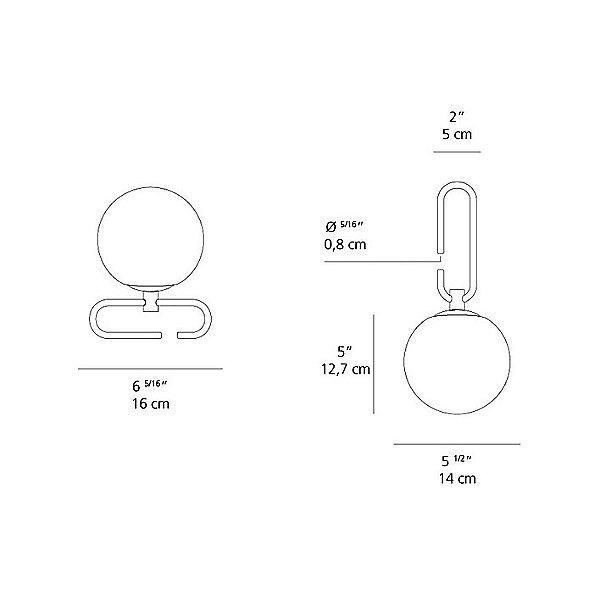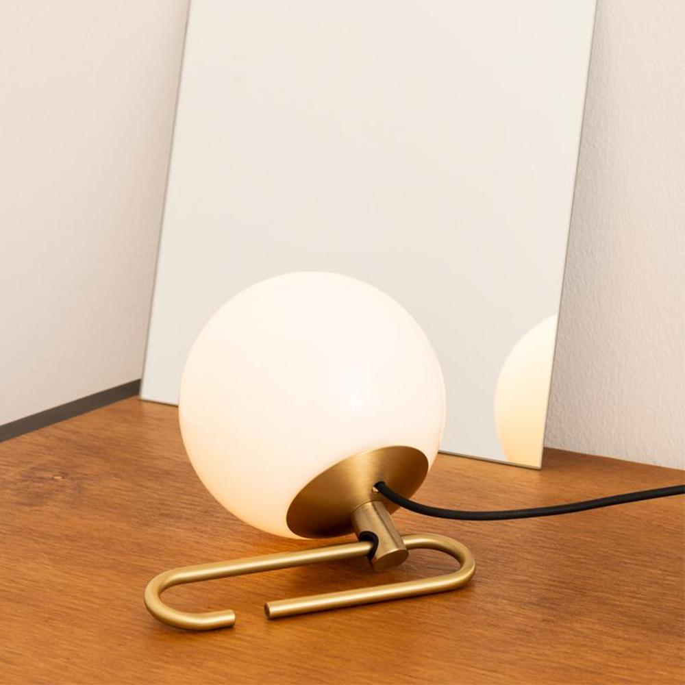 Une sphère en verre soufflé blanc coulisse le long d'un anneau en laiton brossé, ce qui lui permet de prendre différentes positions et d'ajuster et de diriger librement le diffuseur. Le cadre devient un support, un crochet pour accrocher l'appareil au mur, ou une poignée favorisant une interaction avec la lumière.