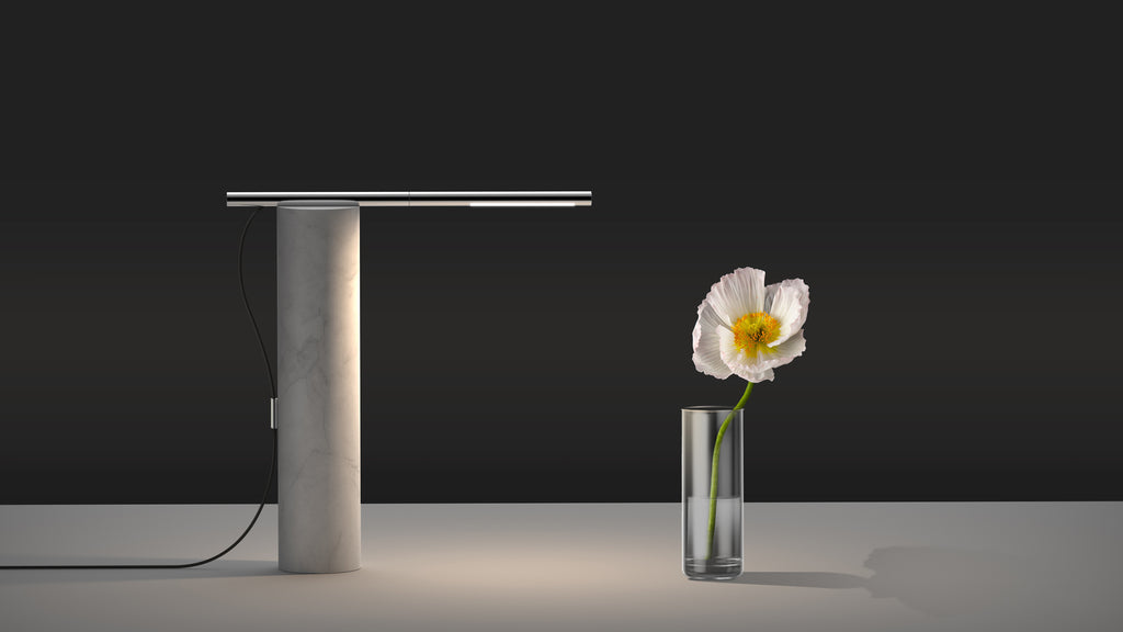 TO célèbre et renforce l'importance de la lumière en tant que pilier de notre vie quotidienne. Une colonne monolithique supporte une ligne de lumière horizontale et verticale pour fournir un contrôle précis de la lumière dans toutes les directions. TO incarne un dialogue harmonieux entre solidité et légèreté offrant des contextes illimités pour une utilisation dans des environnements résidentiels et de travail, le tout dans un encombrement minimal. TO dispose d'une source de lumière LED entièrement dimmable avec un interrupteur tactile positionné de manière appropriée à l'extrémité du bras. Les versions de table et de sol disposent d'un bras d'éclairage fixé magnétiquement sur une base cylindrique en marbre tandis que la baguette lumineuse peut être tournée jusqu'à 360 degrés pour fournir une lumière directe et indirecte pour les besoins d'éclairage de tâche et d'ambiance. T O est proposé en 2 finitions de base en marbre noir Marquina et blanc Carrara tandis que le bras de lumière est élégamment contrasté dans des surfaces polies en laiton et chrome. TO est une intégration harmonieuse de l'éclairage fonctionnel et de la sculpture.