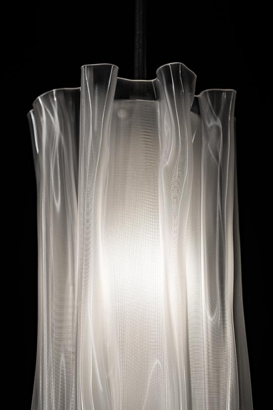 Accordéon est issu de l’exploration de Marc Sadler des possibilités infinies offertes par les technopolymères de Slamp. Qu’elle évoque le plissé d’un tissu ou le soufflet d’un accordéon, cette collection marque pleinement l’ouverture d’un nouveau fil narratif contemporain, où design, mode, savoir-faire et technologie se tendent la main dans un lien indissoluble. Dans la version suspendue verticale, il se compose d’un diffuseur cylindrique d’une longueur de 30 cm – sélectionnable en finitions transparente et dorée -, d’un câble de raccordement au plafond chaussé en noir et d’une mini coupelle noire brillante. Disposé en multiples, pour un rendu d’ensemble élégant et suggestif, c’est  l’éclairage parfait pour des bars, des clubs et des réceptions d’hôtels.