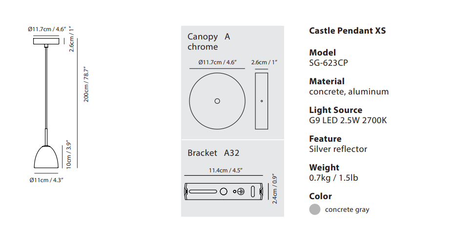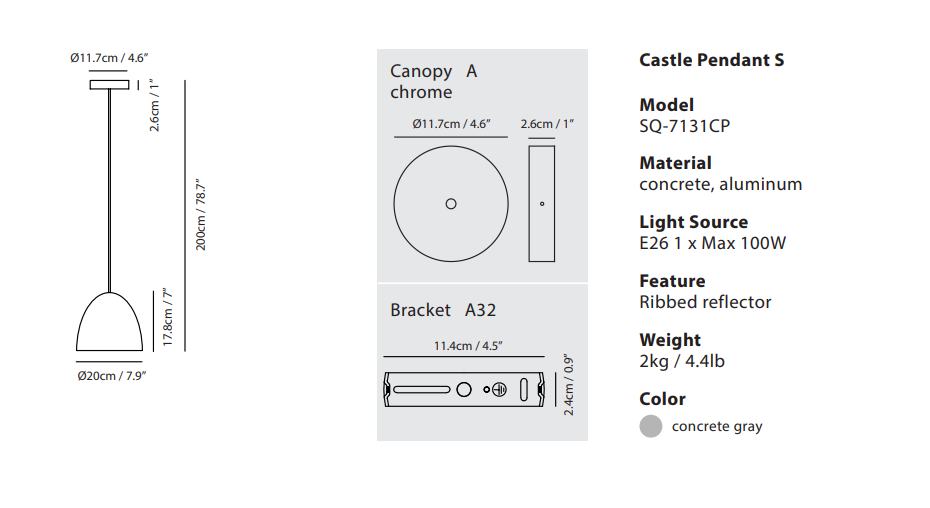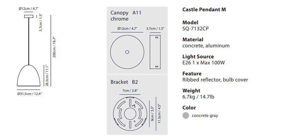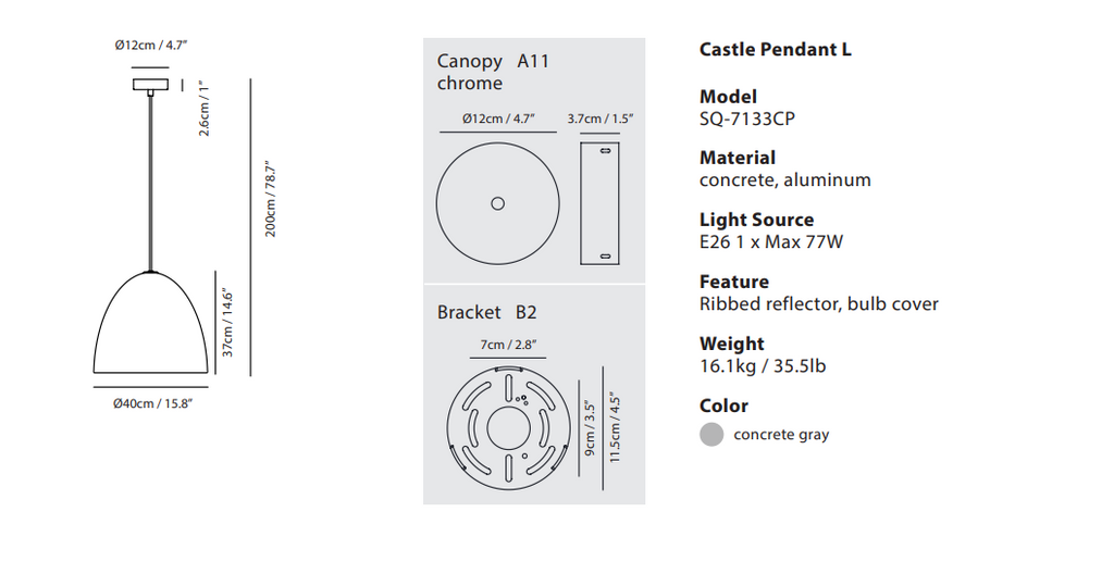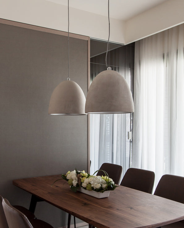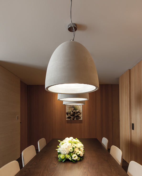 CASTLE désire remettre en question chacune de vos perceptions de texture et d'éclairage. En tant que matériau, le béton est exceptionnellement économe en énergie par rapport à celui du métal ou du verre. En utilisant le béton comme abat-jour, la suspension CASTLE a su rester en phase avec les concepts de la vie verte à l'esprit. Il est livré avec plusieurs choix de pendentifs et d'appliques pour l'extérieur (IP65).