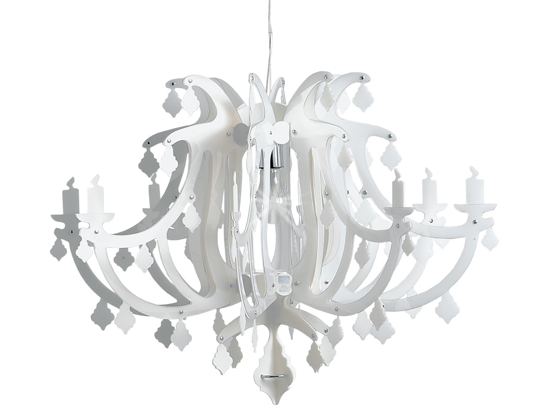 Un lustre à 8 branches classique a subi une évolution numérique ; la somptueuse forme moderne de Ginetta s'étend à partir d'une source lumineuse centrale qui jette des reflets élégants et raffinés, se fondant dans des atmosphères modernes et aristocratiques. Le diffuseur cylindrique en polycarbonate irisé est entouré de trois finitions : métal, prisme ou Opalflex®.