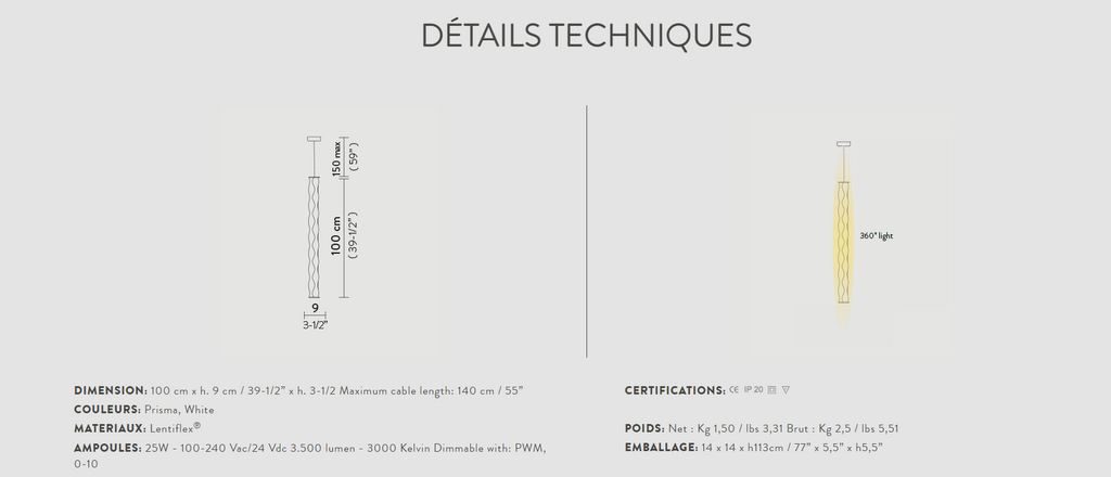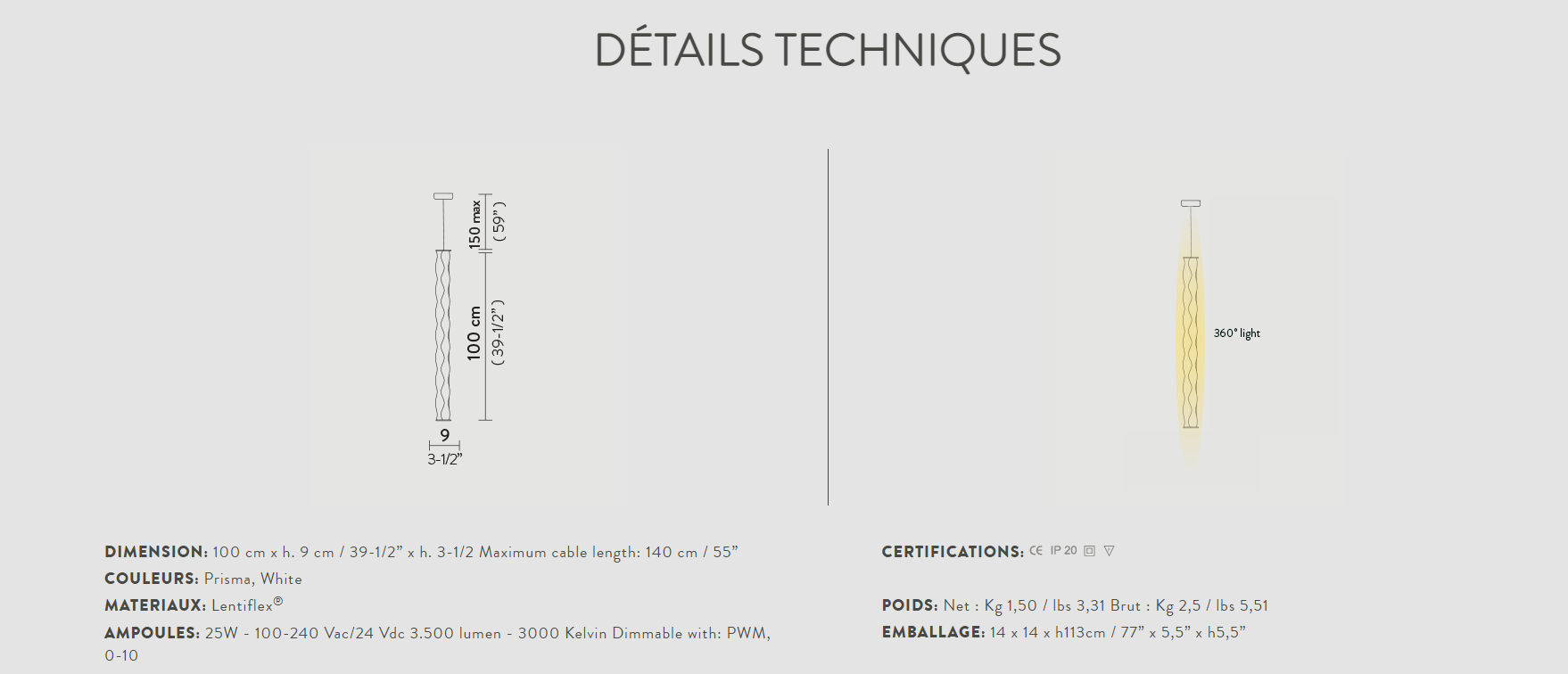 La lampe à suspension Hugo, faisant partie d’un grand système d’éclairage technique-décoratif récompensé par le Red Dot Product Design Award, répond parfaitement aux exigences requises par UNI EN 12464-1 : 2011 pour l’éclairage de bureau (500 lux, U0 supérieur à 0,6 et UGR inférieur à 19). Chaque module, équipé de deux points de suspension et d’un câble coaxial pour épurer les lignes et faciliter l’installation, développe 3500 lumens avec 25W de consommation. L’éclairage LED est fluidifié et adouci grâce au matériau unique de Slamp: le Lentiflex® dans les versions Prisma et Lentiflex® avec impression effet soie dans la version White. Idéal dans des compositions particulièrement spectaculaires pour les grands environnements tels que les halls d’hôtel, les salles de réunion et les centres commerciaux, en utilisant toutes les versions disponibles, telles que Hugo et Hugo Architectural.