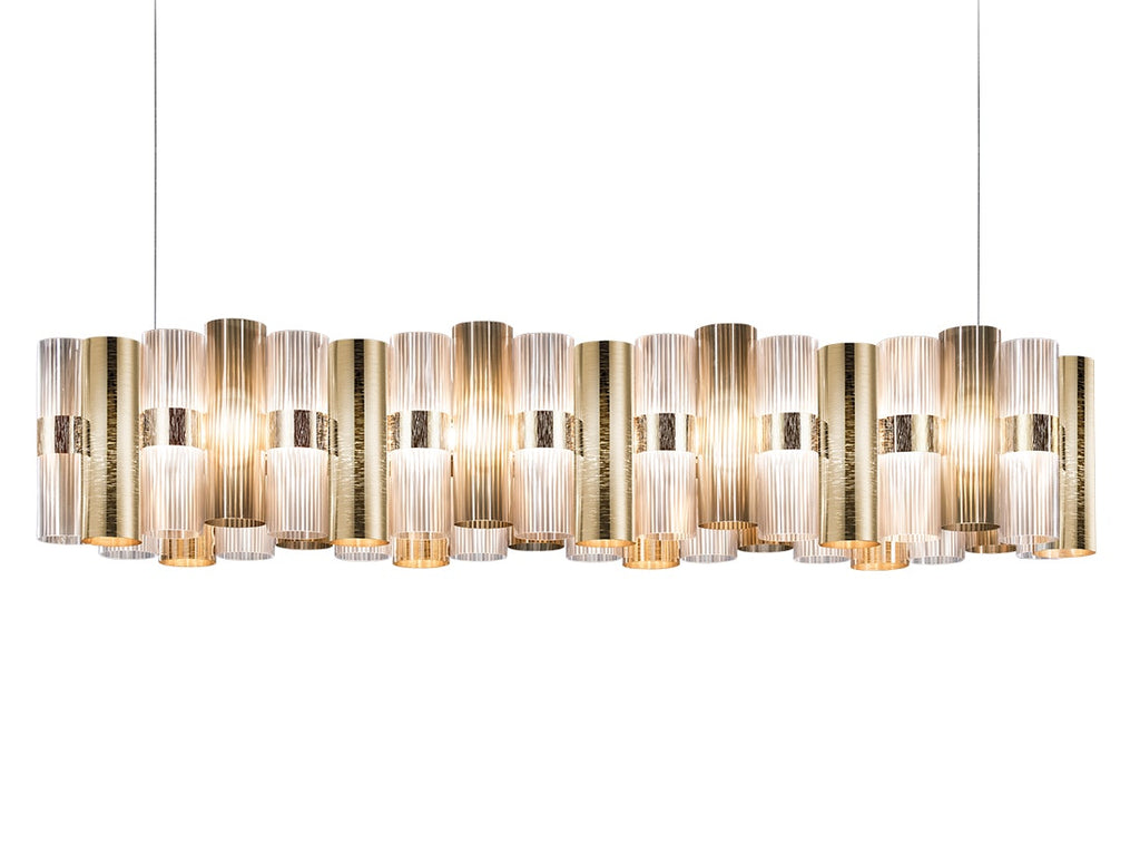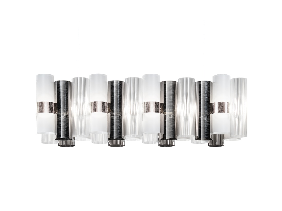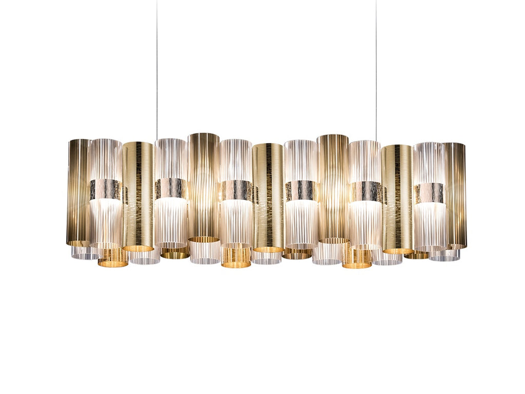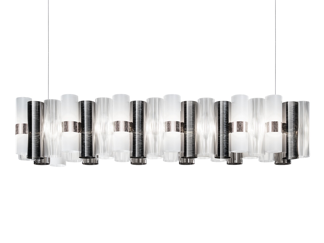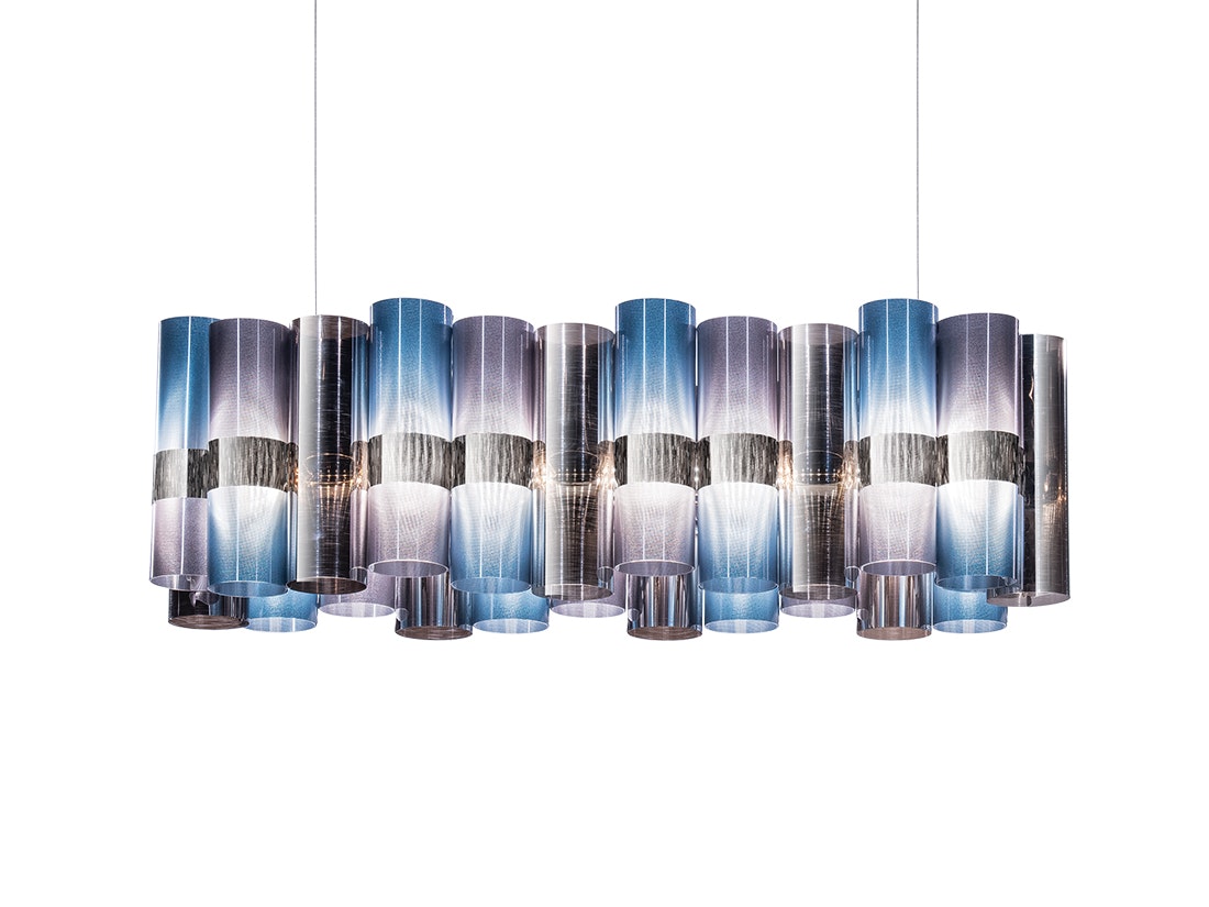 Véritable hommage aux merveilleuses années 50, La Lollo dispose d’un système de suspensions doté d’une ligne gracieuse qui éveille dans l’imaginaire une histoire de divas et de projecteurs. La série de cylindres de technopolymères brevetés se dispose autour d’un anneau central brillant et alterne des couleurs prismatiques, des effets de métallisation, des dentelles, des dégradés de couleurs contemporaines et des dessins géométriques. La collection comprend 2 dimensions différentes, ainsi qu’une version de luminaire somptueuse, prêtes à décorer des espaces intérieurs en mesure de les recevoir, et à créer des installations spectaculaires.