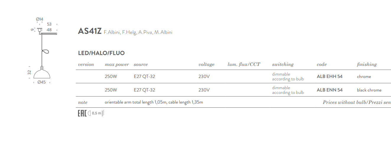 Lampes à suspension avec pièces métalliques à la vue et diffuseur chromé. Faisceau d'inondation Downlight. AS41Z : bras tournant et articulé chromé en profil d'acier, avec serre-câble pour régler la longueur du câble.