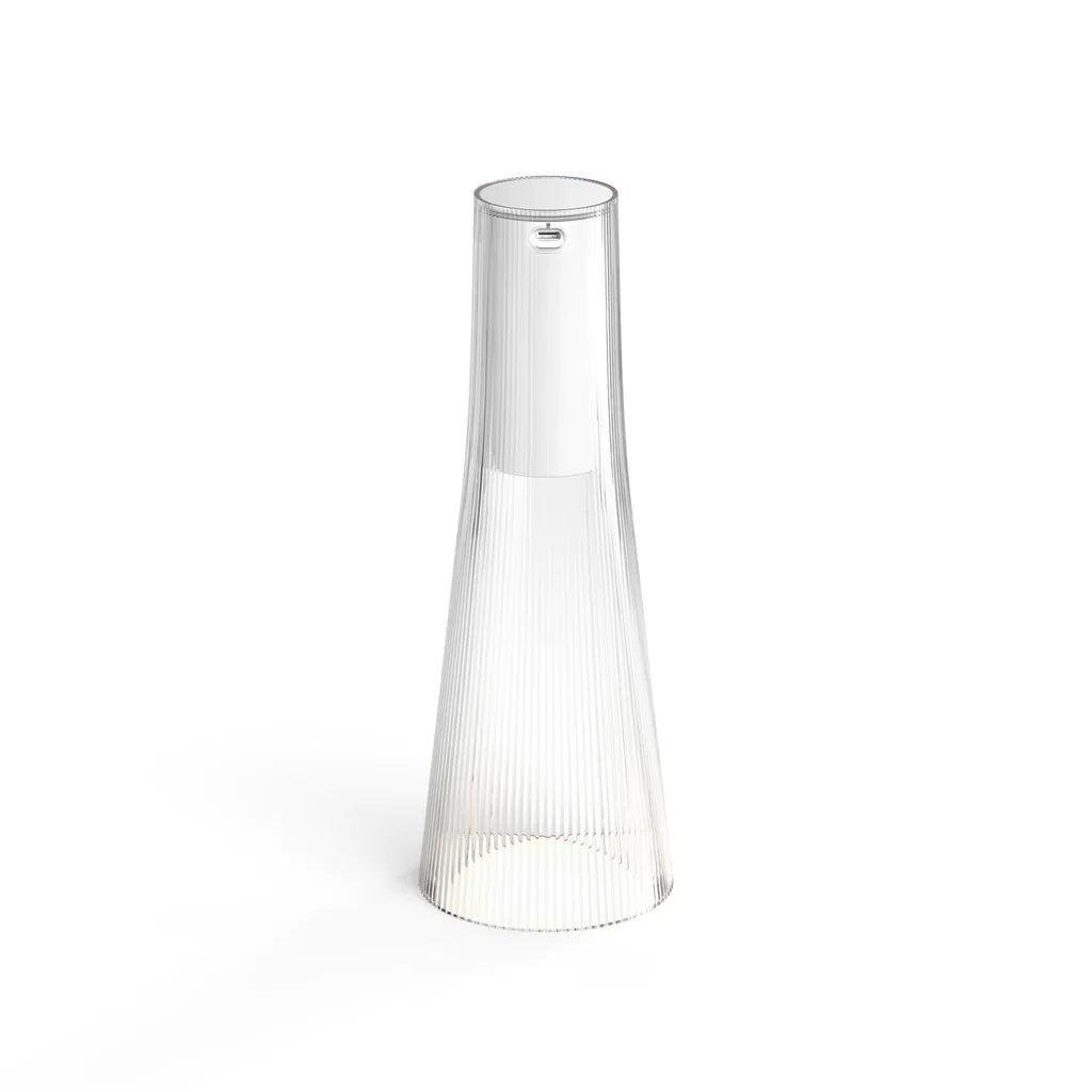 Inspirée par un cône de lumière, la silhouette gracieuse en forme de vaisseau de Candél est en parfaite harmonie avec son environnement, permettant à l'environnement de filtrer. Candél projette une lueur chaleureuse et intime semblable à une bougie qui ne manquera pas de séduire et de devenir le point central de toute réunion sociale. Candél est une lampe LED portable entièrement rechargeable conçue pour l'intérieur et l'extérieur. Dispose d'un corps en PMMA robuste dans les teintes transparente, bronze et fumée combiné à un module d'éclairage en aluminium anodisé frappant qui offre un contrôle tactile capacitif de la lumière pour fournir jusqu'à 4 niveaux d'éclairage pour créer l'ambiance parfaite. L'autonomie de la batterie varie de 10 à 150 heures selon l'intensité lumineuse.