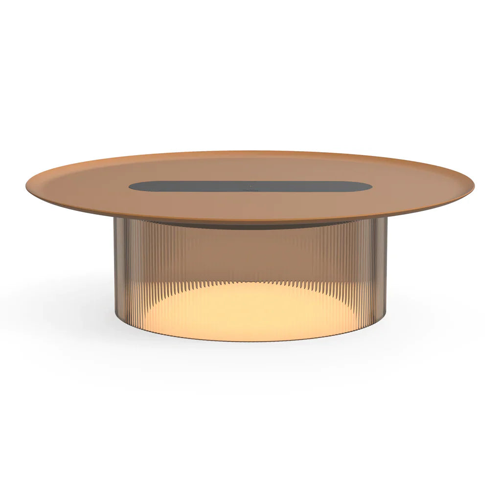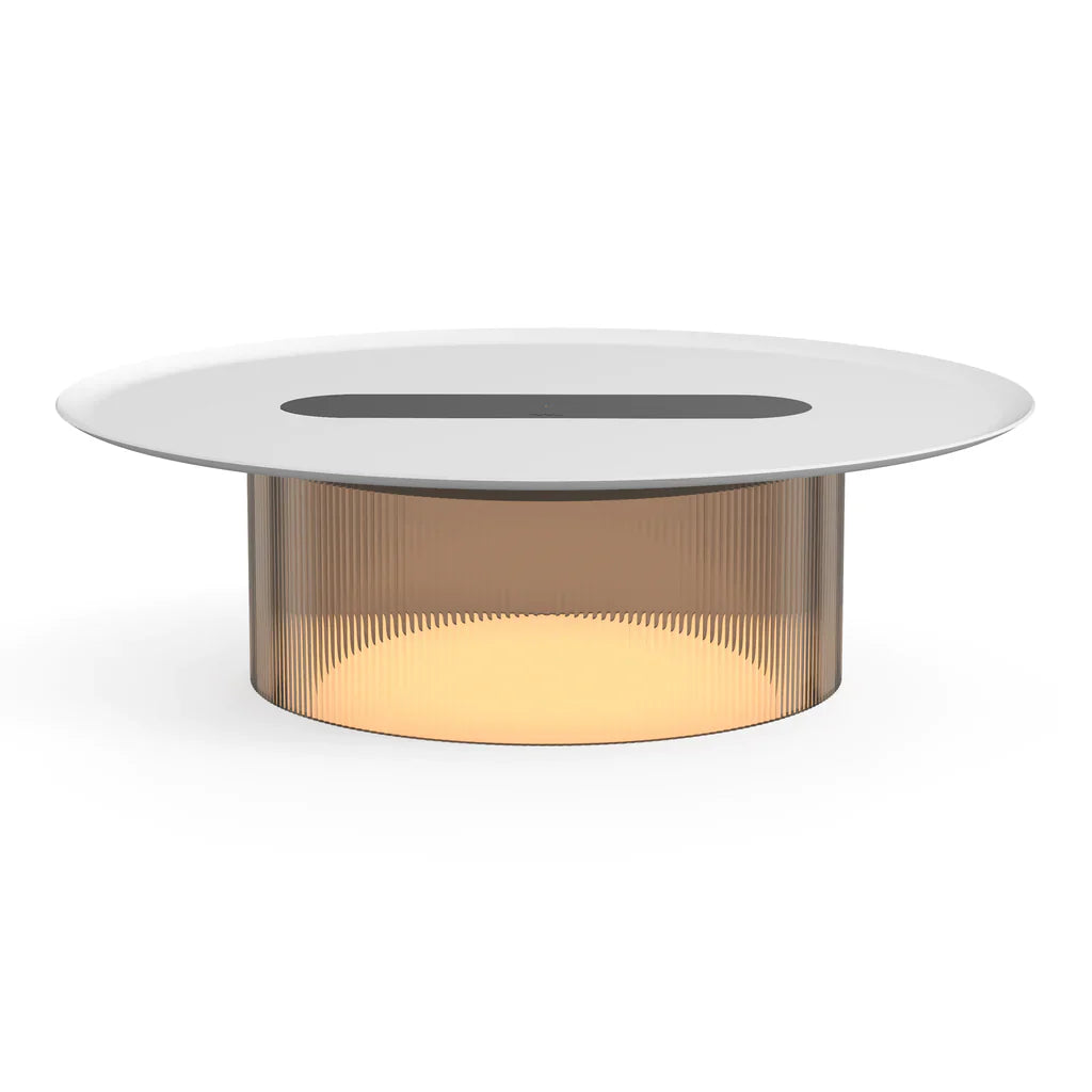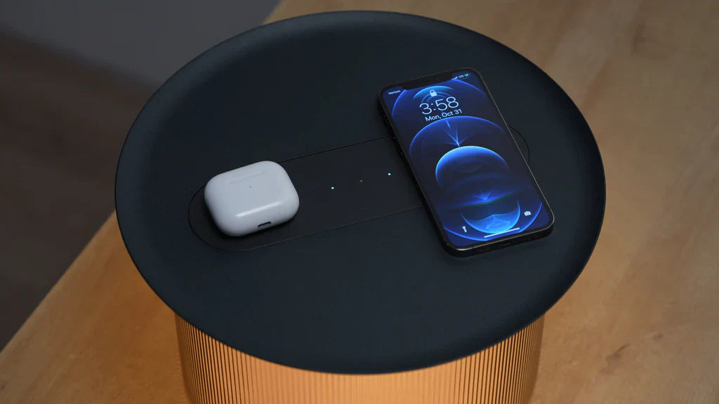 Le carrousel dispose d'une surface de plateau pratique avec deux zones de charge sans fil et un port de charge USB-C pour accueillir une large gamme d'appareils mobiles tout en fournissant un éclairage chaud et indirect via une source de lumière LED à écran plat qui offre un contrôle d'intensité complet pour définir l'ambiance de le moment.