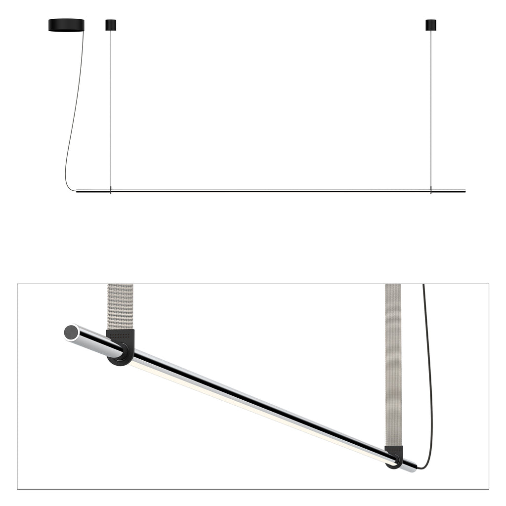 TO célèbre l'importance de la lumière en tant que pilier de notre vie quotidienne. TO dispose d'une élégante baguette de lumière suspendue par deux ceintures décoratives en nylon tissé finies avec des caractéristiques surmoulées qui permettent une rotation complète à 360 degrés pour diriger la lumière dans toutes les directions. TO Pendant peut passer d'une lumière directe orientée tâche à une ambiance indirecte avec un minimum d'effort. Son système de suspension permet une liberté et une créativité ultimes pour suspendre dans une grande variété de configurations allant des séries linéaires aux groupements multi-axes et multi-niveaux pour créer des affichages époustouflants pour les environnements résidentiels et de travail. TO Pendant est proposé dans des finitions chrome poli, noir mat et gris mat associées à des ceintures de suspension en orange brûlé, graphite et gris clair et peut être mélangé et assorti à n'importe quel désir.