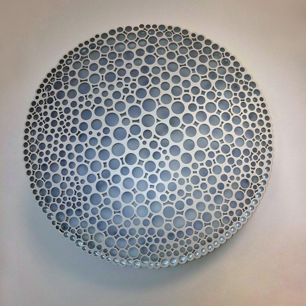 Le diffuseur est construit à partir d'une forme organique en nid d'abeille composé de tubes de différents diamètres, disposés dans une géométrie aléatoire. Non seulement il est visuellement agréable, mais il fournit également une émission directe et confortable de la lumière. Le résultat est un objet d'éclairage très émotionnel qui unit avec intelligence son esthétisme et sa qualité d'optique.