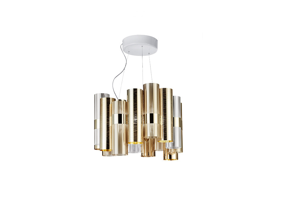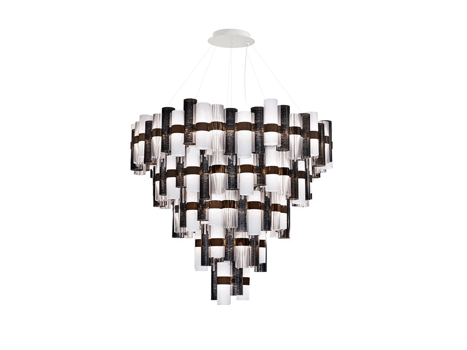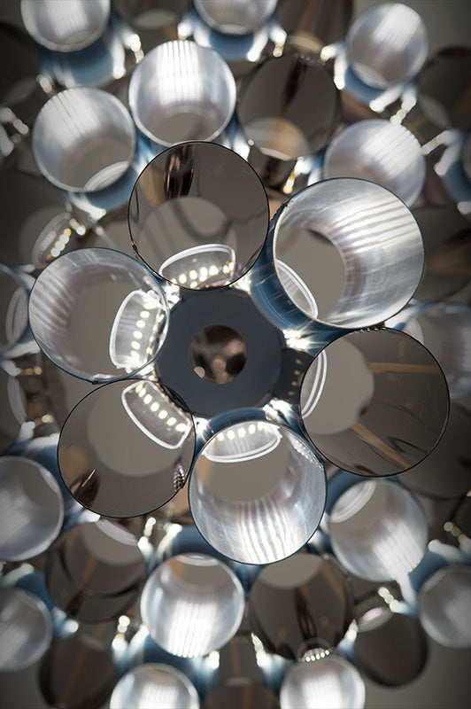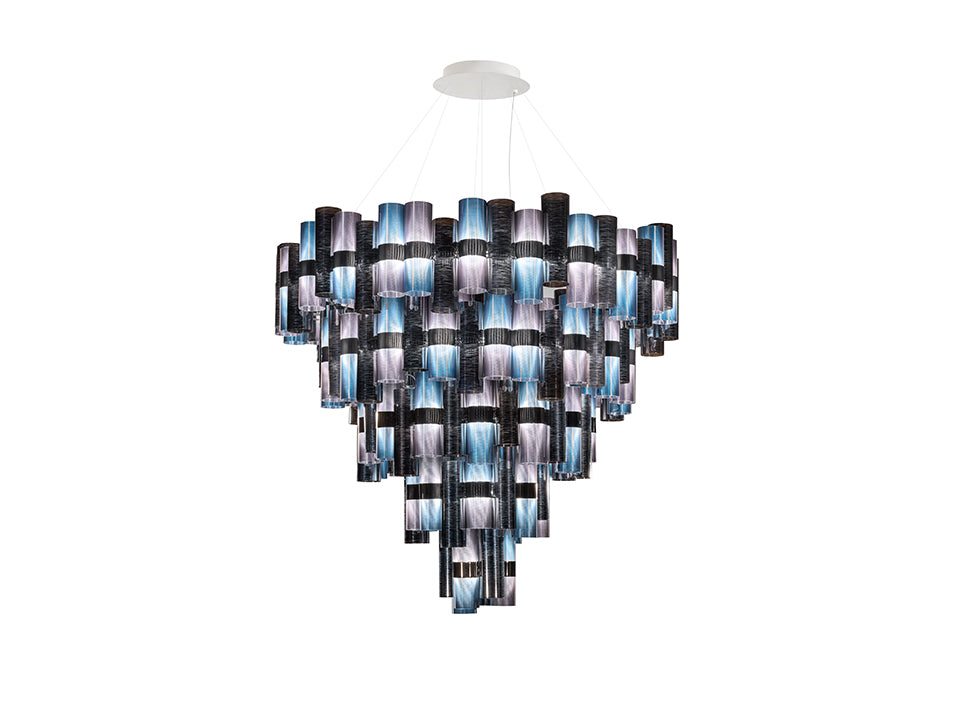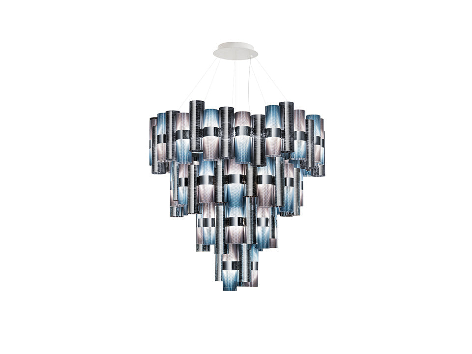 Véritable hommage aux merveilleuses années 50, La Lollo dispose d’un système de suspensions doté d’une ligne gracieuse qui éveille dans l’imaginaire une histoire de divas et de projecteurs. La série de cylindres de technopolymères brevetés se dispose autour d’un anneau central brillant et alterne des couleurs prismatiques, des effets de métallisation, des dentelles, des dégradés de couleurs contemporaines et des dessins géométriques. La collection comprend 2 dimensions différentes, ainsi qu’une version de luminaire somptueuse, prêtes à décorer des espaces intérieurs en mesure de les recevoir, et à créer des installations spectaculaires.