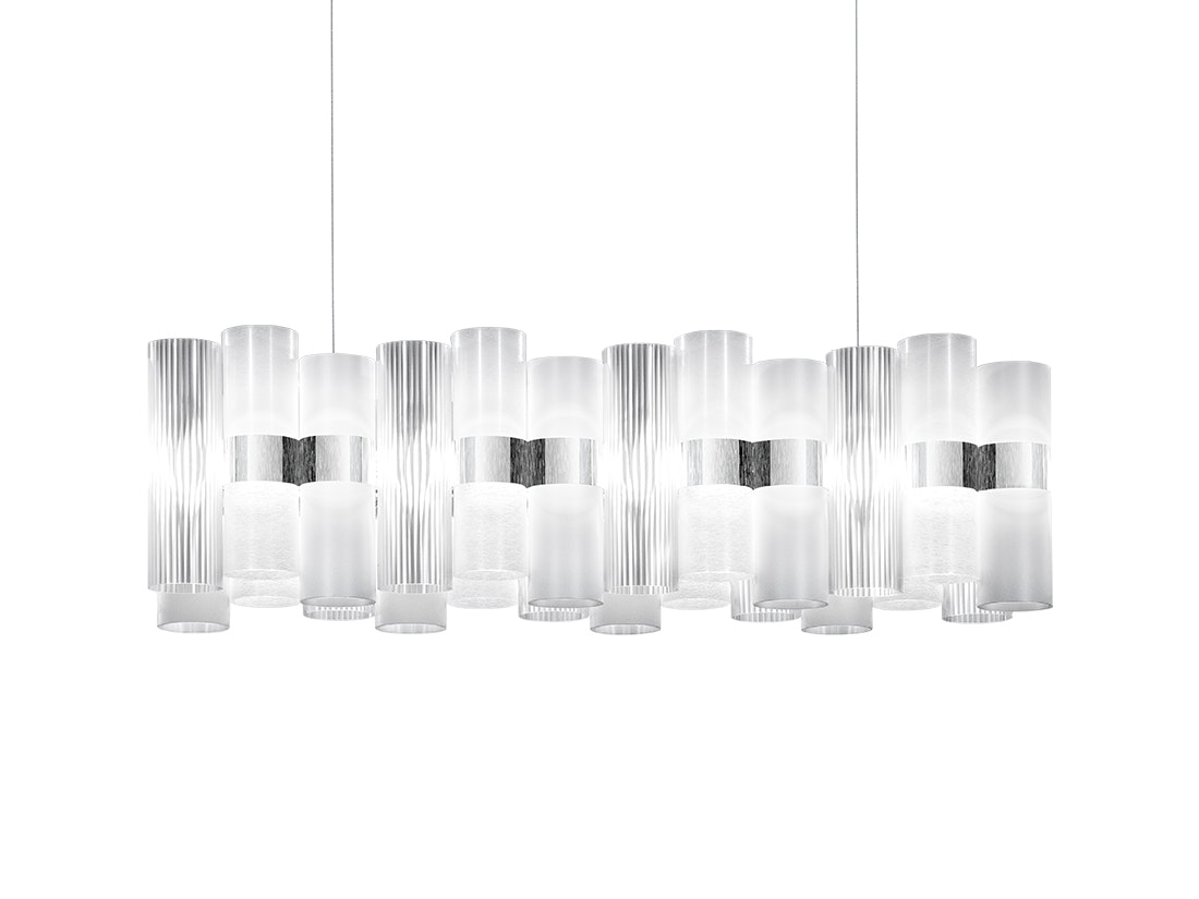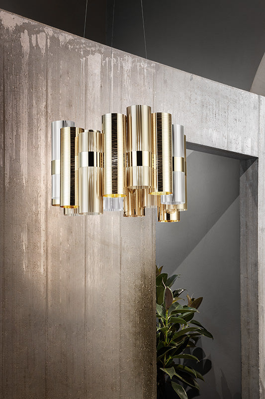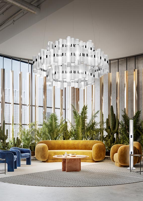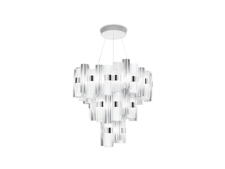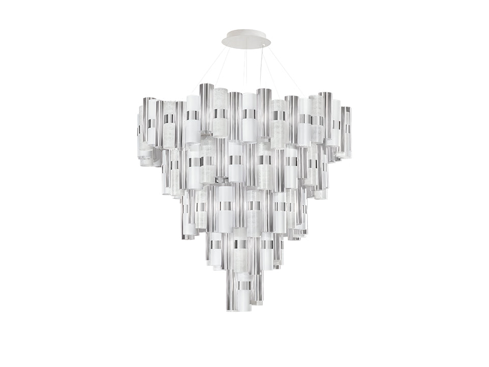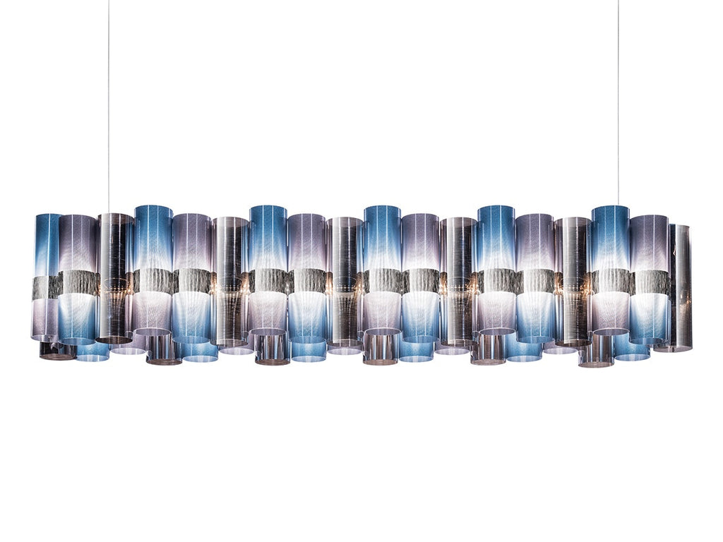 Véritable hommage aux merveilleuses années 50, La Lollo dispose d’un système de suspensions doté d’une ligne gracieuse qui éveille dans l’imaginaire une histoire de divas et de projecteurs. La série de cylindres de technopolymères brevetés se dispose autour d’un anneau central brillant et alterne des couleurs prismatiques, des effets de métallisation, des dentelles, des dégradés de couleurs contemporaines et des dessins géométriques. La collection comprend 2 dimensions différentes, ainsi qu’une version de luminaire somptueuse, prêtes à décorer des espaces intérieurs en mesure de les recevoir, et à créer des installations spectaculaires.