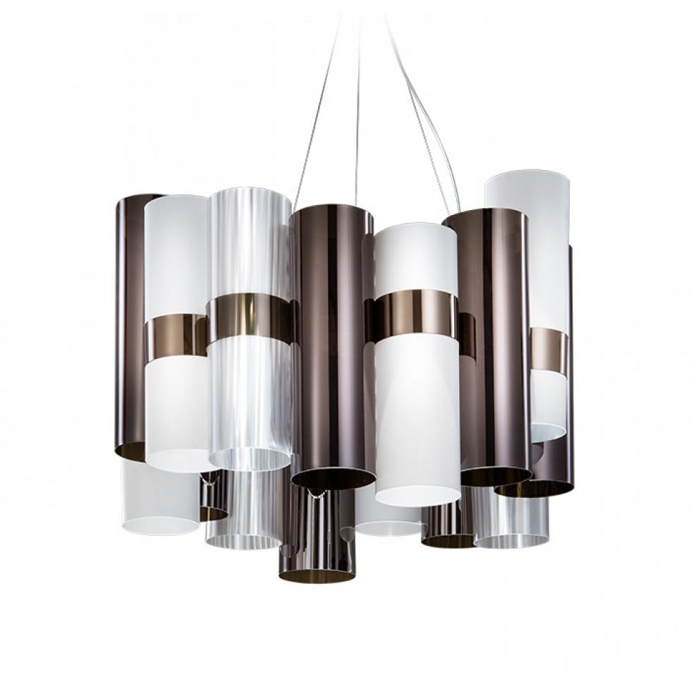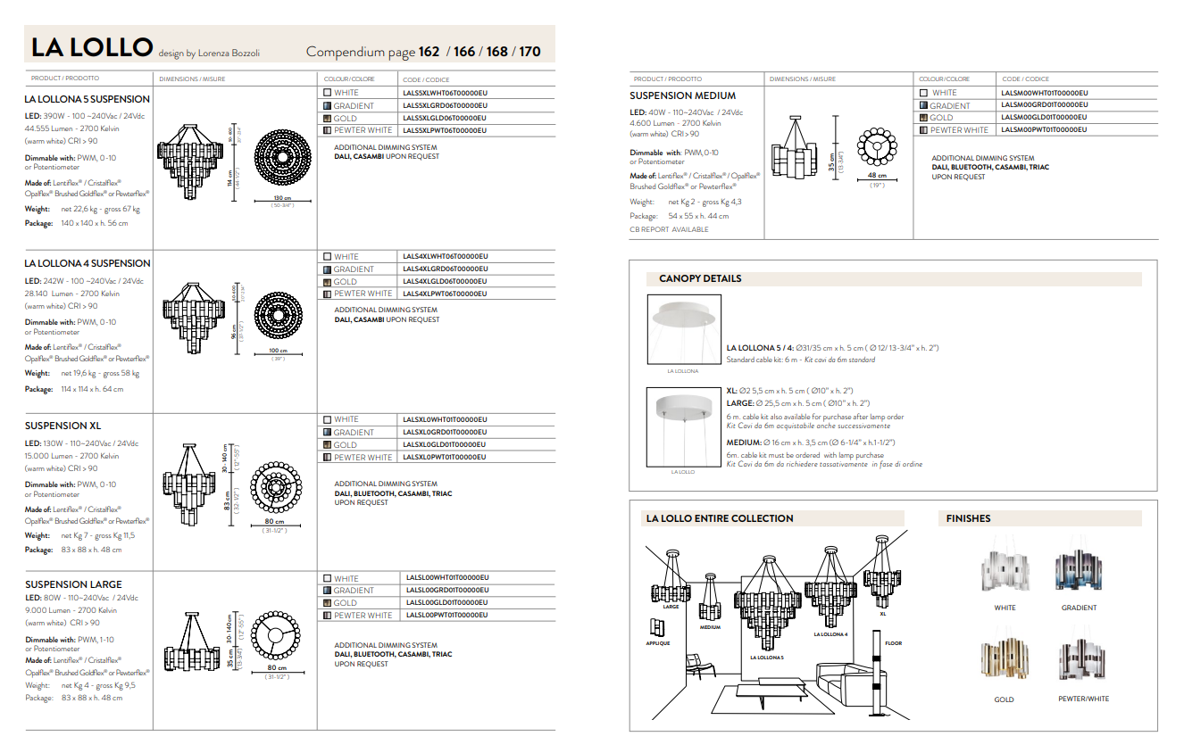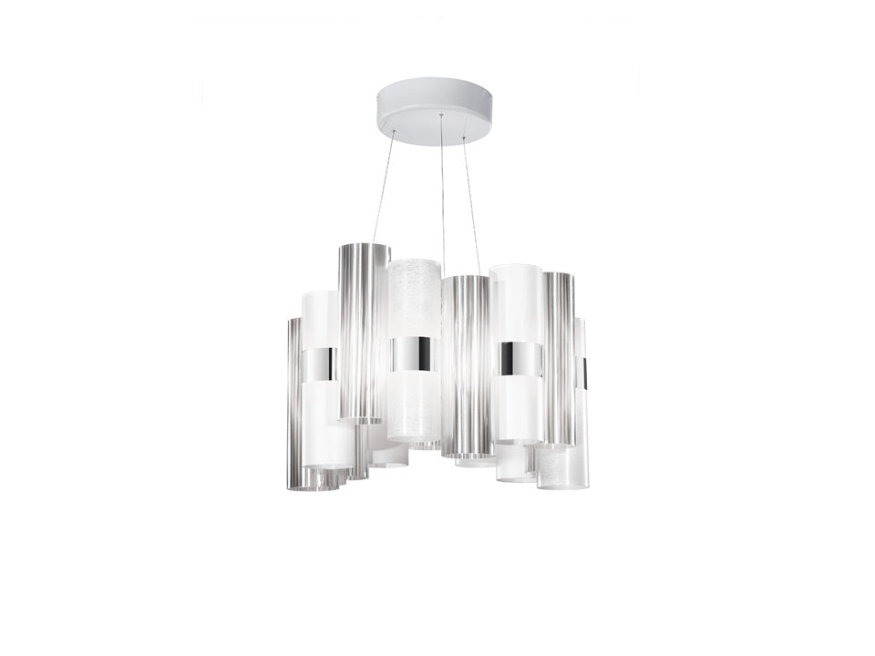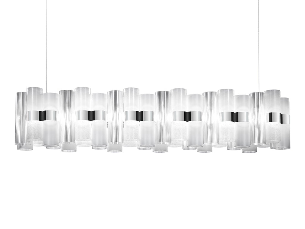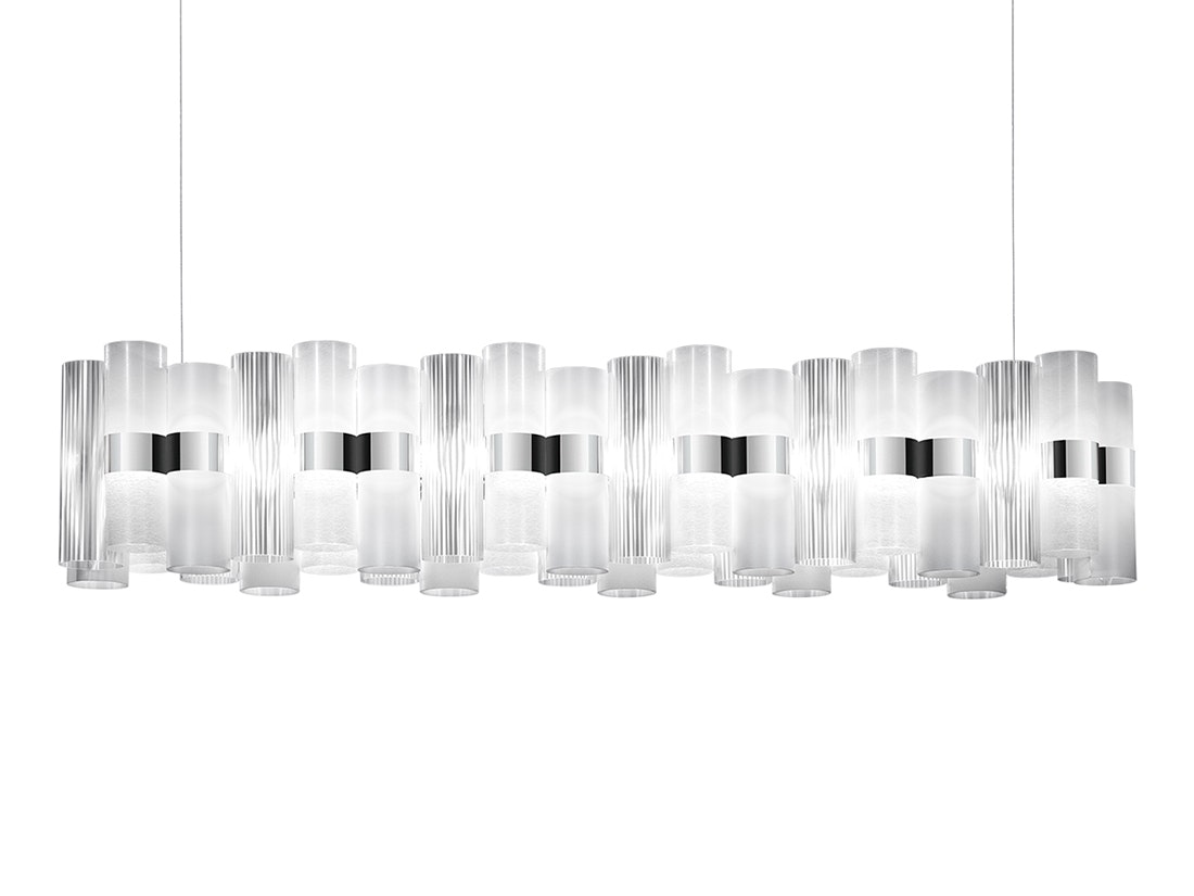 Véritable hommage aux merveilleuses années 50, La Lollo dispose d’un système de suspensions doté d’une ligne gracieuse qui éveille dans l’imaginaire une histoire de divas et de projecteurs. La série de cylindres de technopolymères brevetés se dispose autour d’un anneau central brillant et alterne des couleurs prismatiques, des effets de métallisation, des dentelles, des dégradés de couleurs contemporaines et des dessins géométriques. La collection comprend 2 dimensions différentes, ainsi qu’une version de luminaire somptueuse, prêtes à décorer des espaces intérieurs en mesure de les recevoir, et à créer des installations spectaculaires.