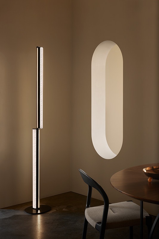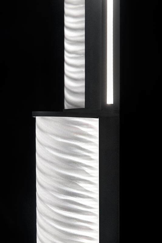 Modula joue avec la Lumière de manière inattendue et polyvalente. Les effets Plissé, inspirés des colonnes des cloîtres médiévaux, et Crystal, qui rappelle une texture de strass brillants, sont ce qui fait de la lampe une véritable explosion de créativité. L’expression lumineuse est amplifiée par une ligne de lumière homogène qui court le long de la dorsale.