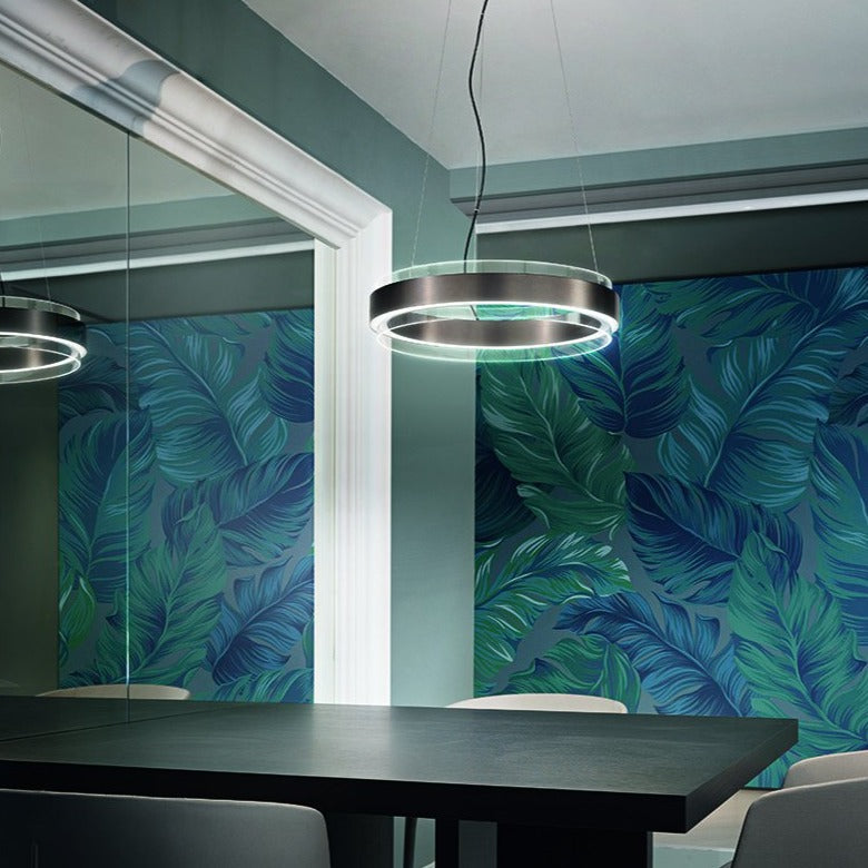 Élégant jeu de géométries et de joints circulaires à forte connotation décorative, qui embellit et illumine la pièce avec une personnalité forte mais discrète. La source de lumière LED est très efficace et complètement cachée dans la structure. L'éclairage direct définit la zone de lumière ci-dessous, rehaussant la beauté naturelle des tons fumés, ambrés et cristallins agrémentés de finitions cuivre et or brossé.