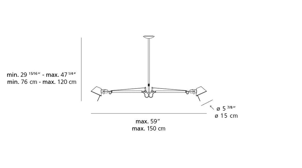 Ses deux bras orientables longs et fins en aluminium poli sont raccordés à une tige dont la hauteur est réglable de façon à pouvoir s’adapter à toutes les hauteurs de plafond.