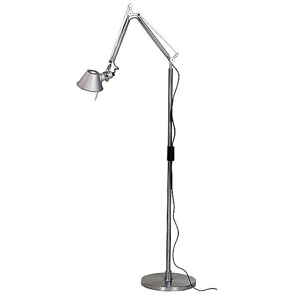 Cette lampe de sol produit une impression de légèreté. Ses deux bras orientables longs et fins sont en aluminium poli. Le bras inférieur peut subir un porte-à-faux jusqu'à un angle de quinze degrés. La tête du luminaire en aluminium anodisé opaque est orientable dans toutes les directions au moyen d'une petite tige. Ce luminaire d'une extrême mobilité peut être placé dans des positions très variées en raison de son système d'équilibrage à ressorts avec ses joints et fixations en aluminium poli ainsi que son câblage conduit sur des poulies.
