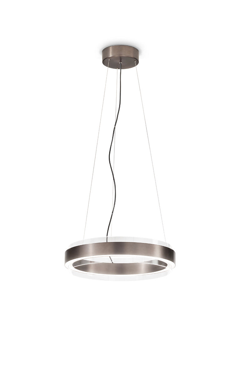 Élégant jeu de géométries et de joints circulaires à forte connotation décorative, qui embellit et illumine la pièce avec une personnalité forte mais discrète. La source de lumière LED est très efficace et complètement cachée dans la structure. L'éclairage direct définit la zone de lumière ci-dessous, rehaussant la beauté naturelle des tons fumés, ambrés et cristallins agrémentés de finitions cuivre et or brossé.
