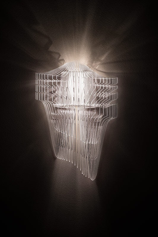 L'architecture lumineuse de Zaha Hadid est visionnaire, fluide et dynamique, insufflant la sémantique révolutionnaire et emblématique de l'architecte renommé dans les intérieurs domestiques et publics ; le résultat ? L'harmonisation des êtres et de leurs espaces environnants. La version appliquée à 25 couches est disponible dans une finition transparente ou dorée qui projette des réfractions sur le mur derrière elle.