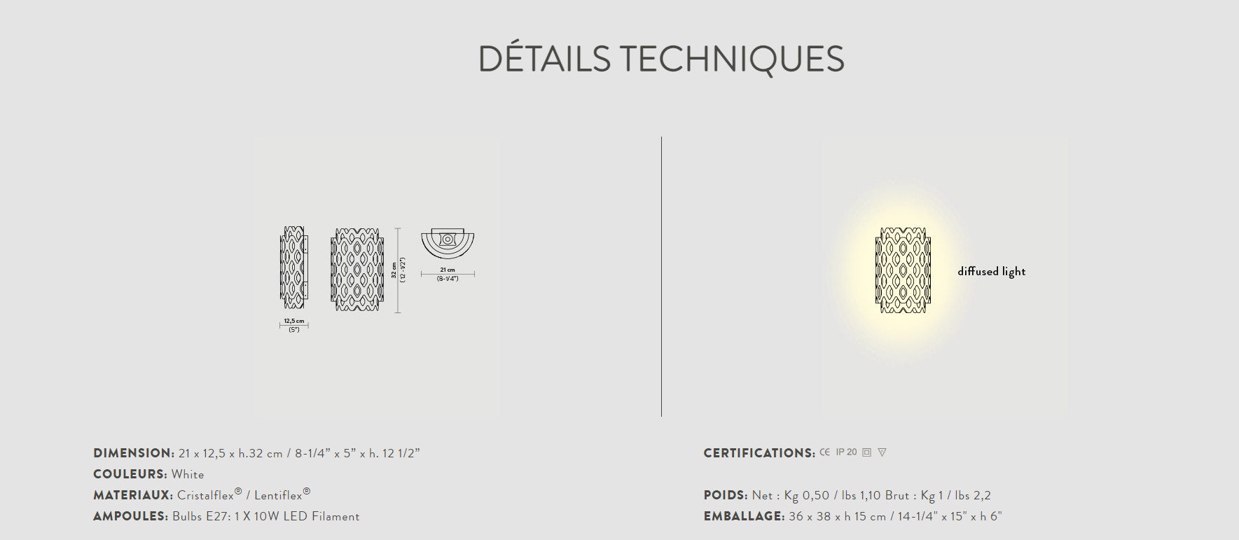 Charlotte Applique est issue de monde de l’illusion, du défi de transformer un élément bidimensionnel en volumes qui se multiplient à l’infini. La surface réfléchissante cachée à l’intérieur de cette lampe murale amplifie la puissance de l’ampoule en mettant en évidence la trame hypnotique des hexagones concentriques caractéristiques du design signé Fuksas. Réalisée entièrement à la main en Cristalflex®, Charlotte Applique est munie d’un double système d’accroche : comme un cadre, pour ceux qui veulent éviter de percer leur mur, ou avec des points d’ancrage muraux pour ceux qui préfèrent davantage de sécurité. La collection comprend une lampe de terre et trois suspensions différentes.