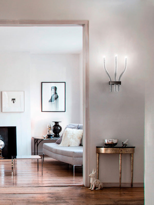 Collections de lustres à bras en cristal soufflé et fabriqué à la main. Les cadres métalliques cachent un système de fixation original des bras et du système de câblage.