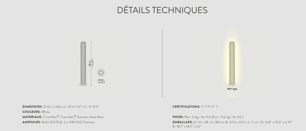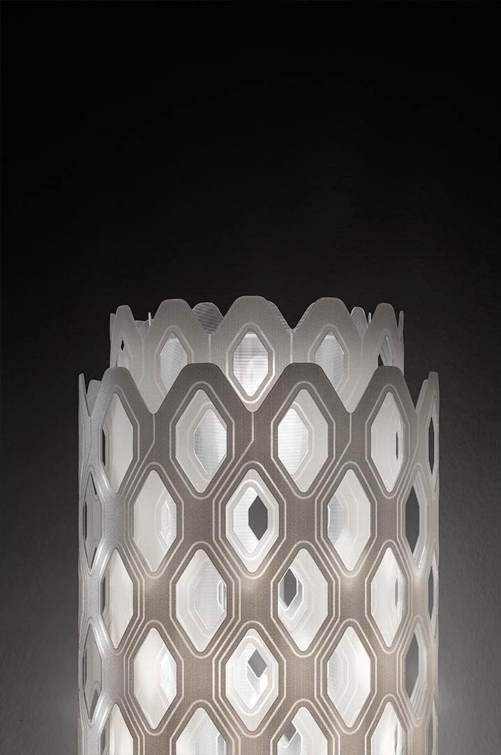 L’idée naît du monde de l’illusion, du défi de transformer un élément bidimensionnel en volumes qui se multiplient à l’infini ; une lumière qui rappelle une course poursuite d’ondes et la transparence du moment pendant lequel elles diminuent, se dématérialisent en renvoyant d’interminables gouttes de lumière. Dans toutes ses déclinaisons multiformes, Charlotte semble modelée d’un seul bloc avec une trame laborieuse, aux traits impalpables, comme celle d’une ruche, à travers laquelle on peut pénétrer par les formes hexagonales concentriques et hypnotiques pour avoir une perspective toujours renouvelée, quel que soit le point de vue.