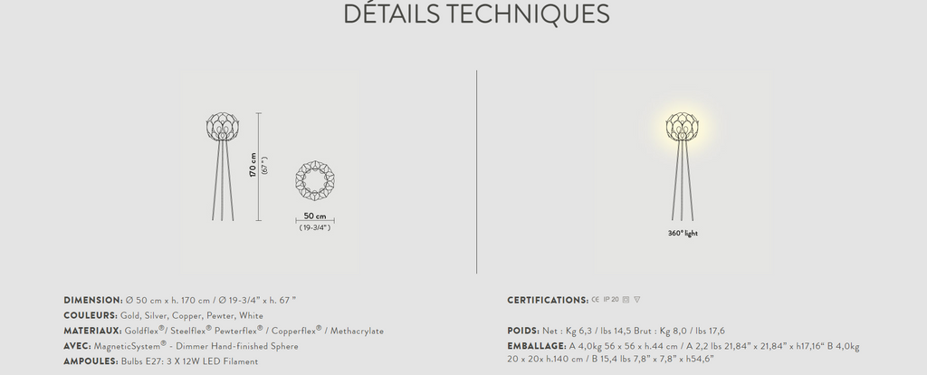 D’une terre baignée de soleil, où la nature, le savoir-faire artisanal et les couleurs donnent vie à des signes caractéristiques très expressifs et riches d’archétypes, naît Flora, véritable Monstera deliciosa si l’on observe sa forme végétale. 60 pétales se déploient autour d’une sphère brossée, cœur lumineux de la lampe disponible soit en suspension, soit en lampe de sol portée par de fines tiges qui rappellent les pistils d’une fleur. Les finissions brillantes des pétales sont réalisées à partir d’un système de vaporisation d’aluminium novateur, en vue de créer un jeu de réfraction de lumière, comme s’il avait été volé à l’effet naturel du soleil lorsque celui-ci est au zénith.