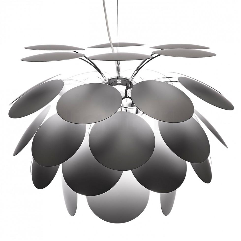 Exuberant even when turned off, the richness of the light issuing from the Discocó lamp provides direct downward illumination along with a dramatic play of lights and soft shadows. Its detailed study of incident light and light that bounces off of both sides of the 35 disks provide the lamp with an appealing gradation of light nuances and depth. Further reflections dance off the chrome-covered sphere at the core, where the disks are anchored. When the light is turned off, it retains its attractive presence, hinting at the expansion of energy that is fully expressed when it is turned on. Two new tones, beige and grey, have been added to the existing color range, this time with a matte finish. A new 68 cm diameter is also available, making a total of five sizes to cover a host of applications.