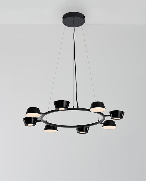 La suspension circulaire transmet l'expression nostalgique qui remonte à la table ronde, qui symbolise la «réunion» dans la cuisine traditionnelle chinoise. Abat-jour rotatif intégré dans la conception de pointe de cercles creux avec éclairage LED sans éblouissement, la lumière adoucie CRI 90 peut créer de manière impressionnante une lumière pratique et ambiante. Parfois, la distribution de la lumière est autorisée en raison de la structure rotative de chaque abat-jour. À l'envers ou à la baisse, laissez libre cours à votre imagination et laissez le plaisir commencer.