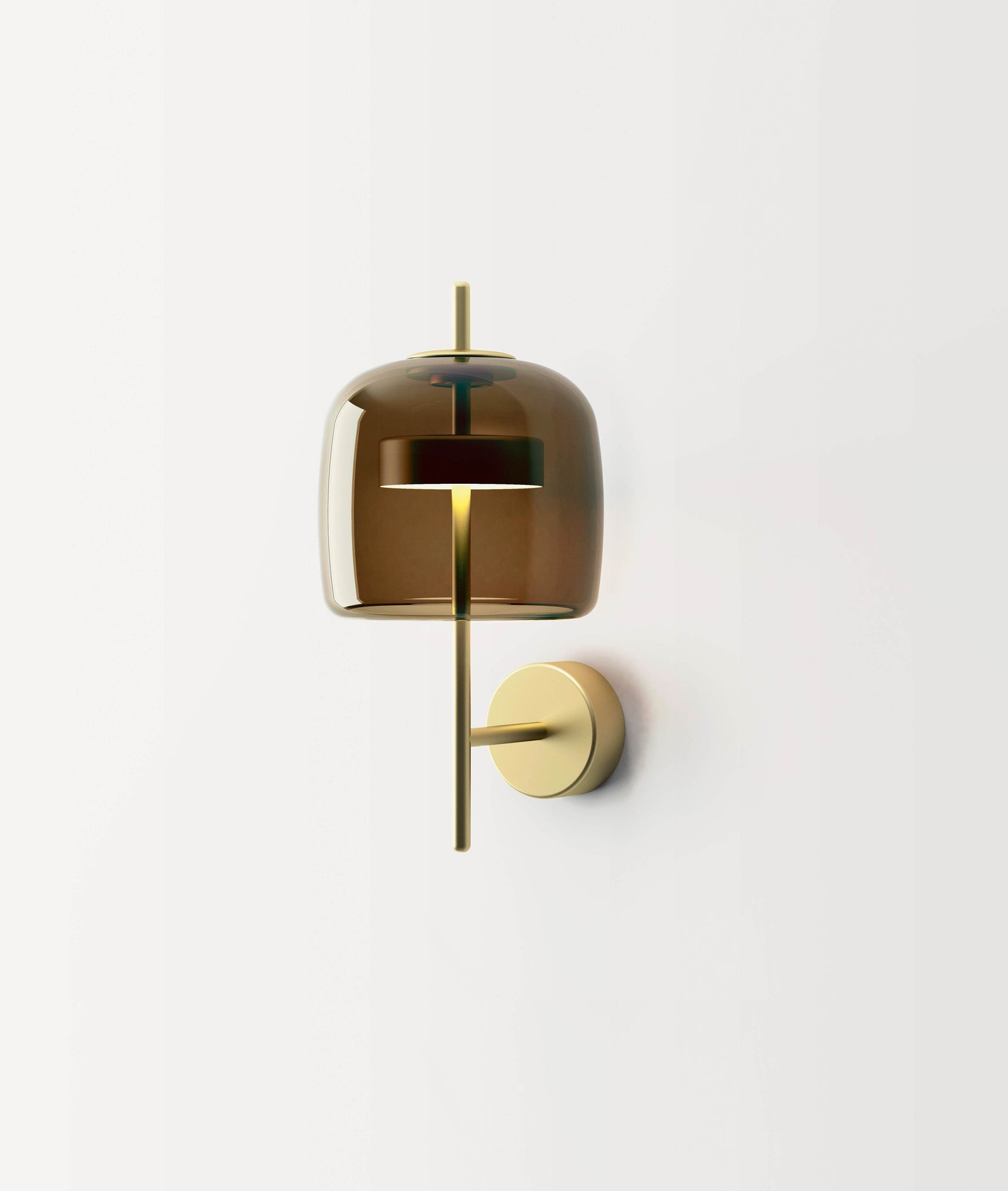 Retro charm. The elegant and delicate look of blown glass finds a new dimension in Jube. Two glass units placed side by side, perfectly assembled, so much so that they look like a unique piece. The result is a sinuous lamp, formed by superimpositions and with tone-on-tone colours that give it a precious, vintage mood. After the suspension, the collection is enriched with two new table versions, a new size of suspension and a new applique on a unique glass. Upper glass shades is available in four colours: smoky, burnt earth, antique green, crystal, metal parts finishes are satin gold. LED light source.