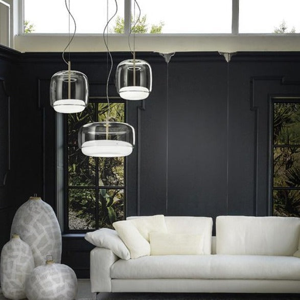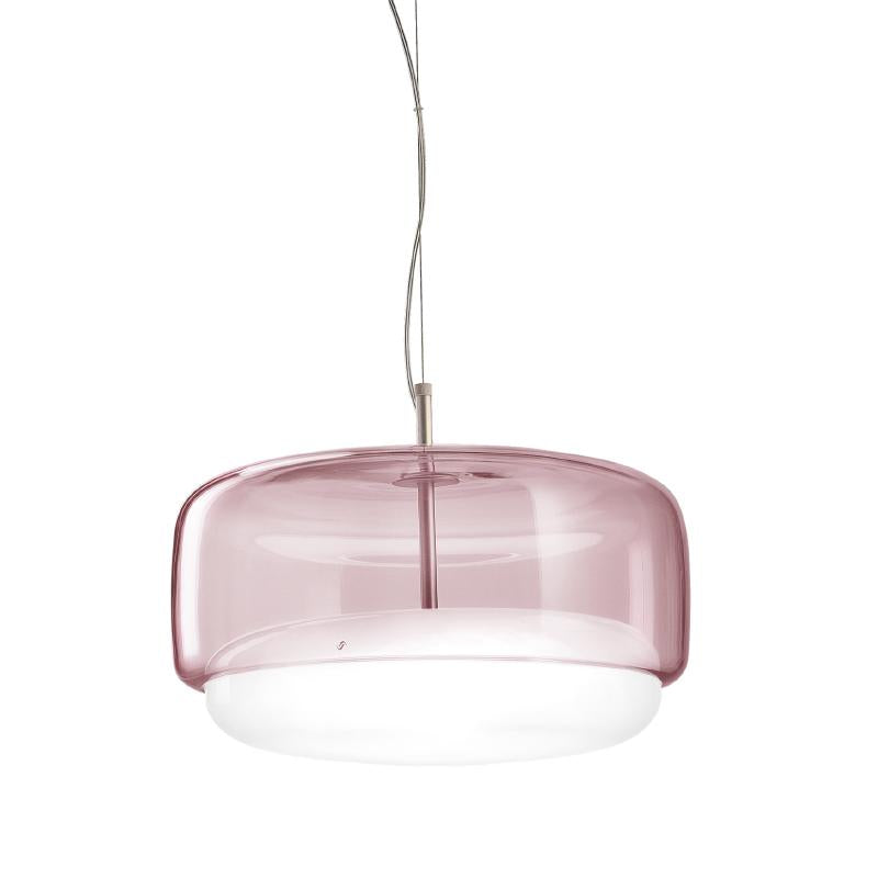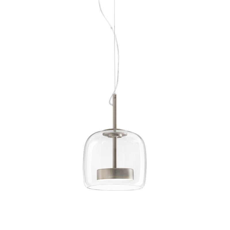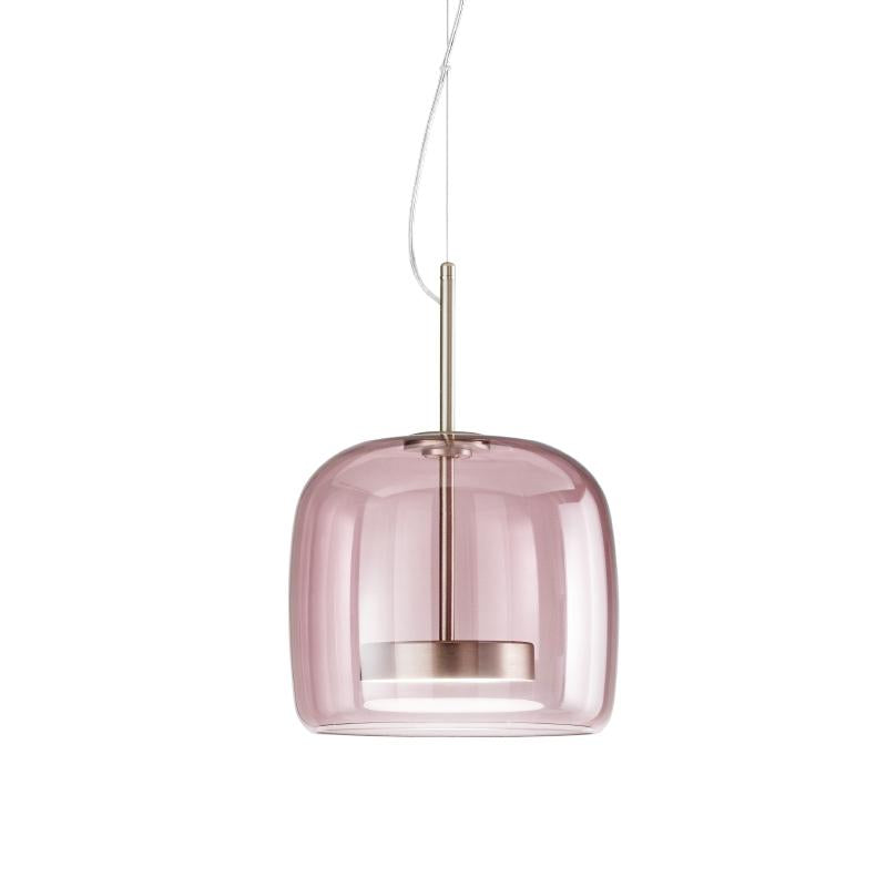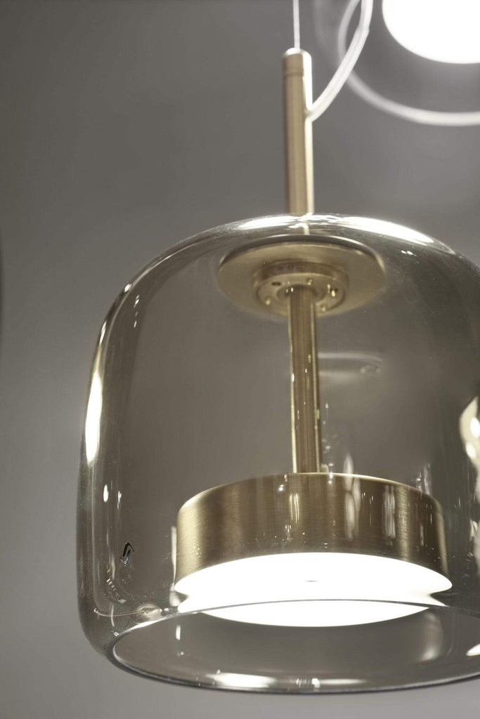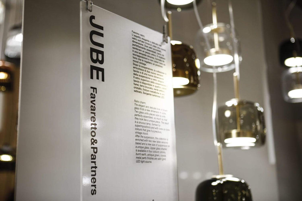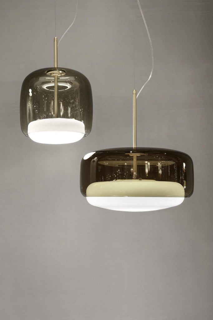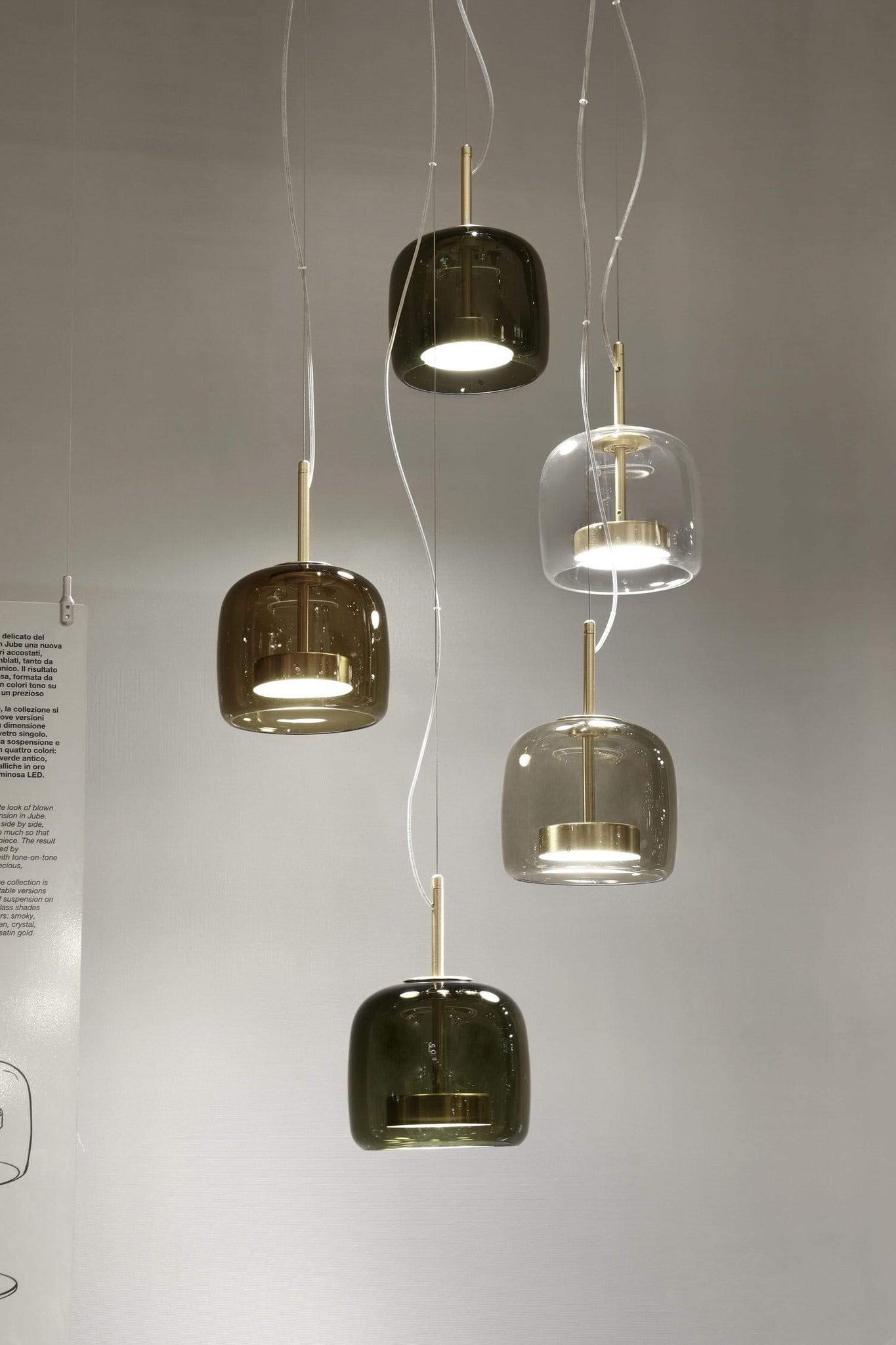 Retro charm. The elegant and delicate look of blown glass finds a new dimension in Jube. Two glass units placed side by side, perfectly assembled, so much so that they look like a unique piece. The result is a sinuous lamp, formed by superimpositions and with tone-on-tone colours that give it a precious, vintage mood. After the suspension, the collection is enriched with two new table versions, a new size of suspension and a new applique on a unique glass. Upper glass shades is available in four colours: smoky, burnt earth, antique green, crystal, metal parts finishes are satin gold. LED light source.
