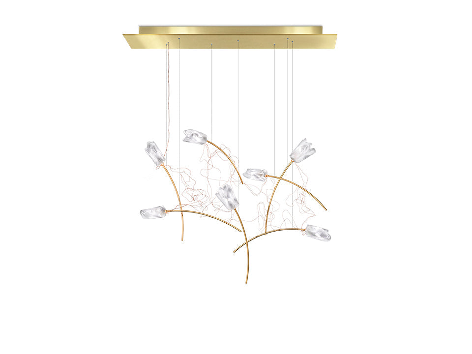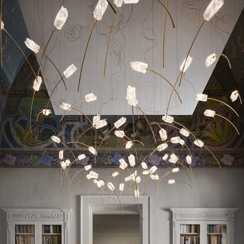 Élégante, légère, onirique. La tulipe habille littéralement l’air d’une succession de tulipes issues de la corolle en Lentiflex® modelées à la main à la manière de Slamp, de façon que chaque fleur soit unique. Le câble en acier, parfois invisible, retient les fleurs lumineuses qui s’épanouissent à partir de tiges en laiton brossé, inclinées de manière prédéterminée pour suggérer une morphologie naturelle, suspendues dans l’espace. Chaque tulipe est connectée en série à la suivante par un fil en cuivre enchevêtré et complexe qui conduit l’électricité à basse tension. La collection est présentée dans les configurations plug & play (7 ou 14 fleurs descendent d’une rosace rectangulaire ou ronde en laiton brossé) ou autoportant, en configurant votre installation comme vous le souhaitez en multiples de 14. Les sources lumineuses LED sont incluses et peuvent être remplacées autonomement.