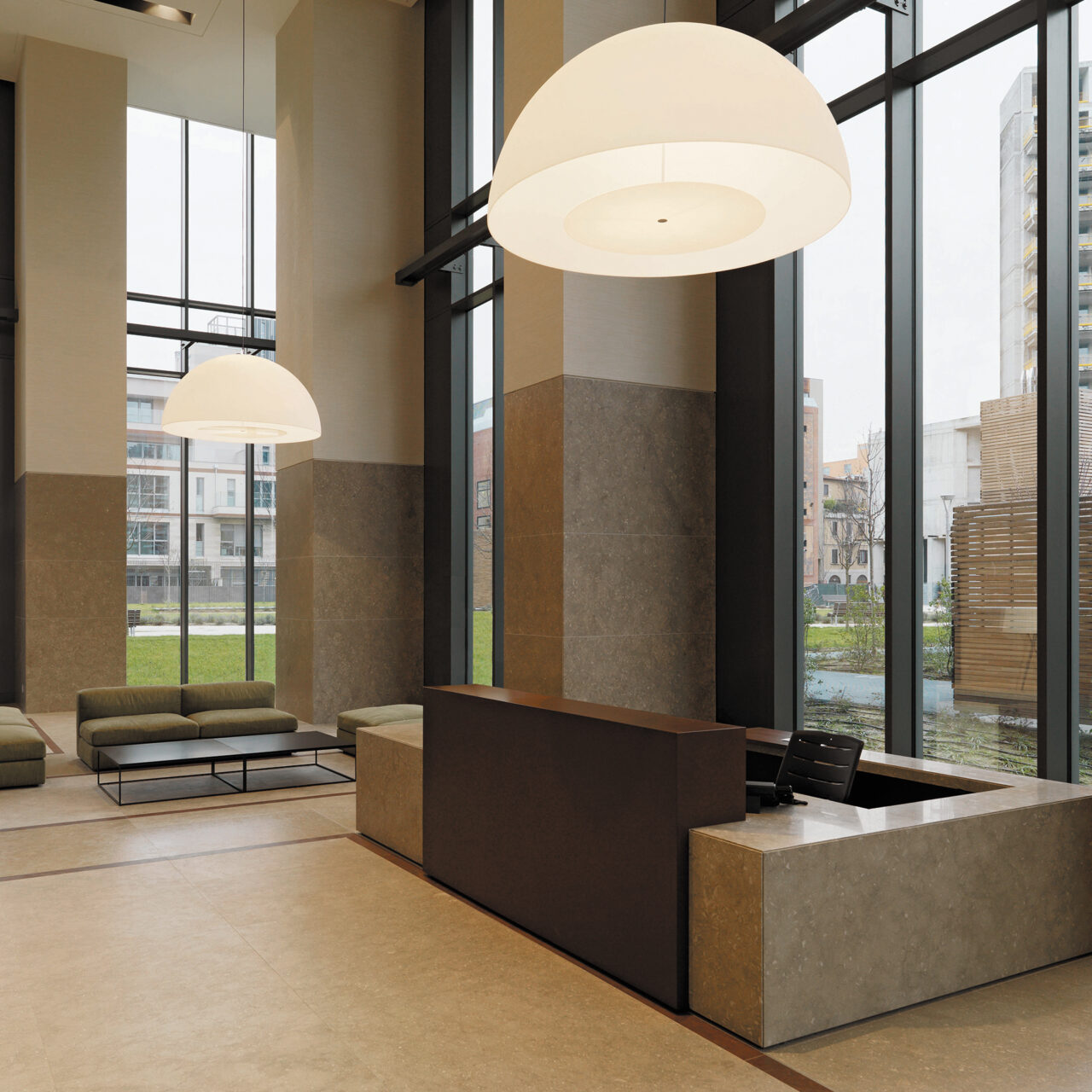 Suspension à fort impact, spectaculaire grâce à ses grandes dimensions, disponible en diamètres de 120 et 160 centimètres. Diffuseur argenté et doré sur demande. Un disque inférieur couvrant et masquant les sources lumineuses est disponible séparément.