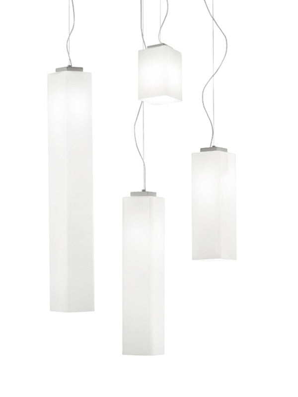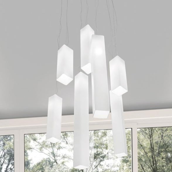Une série de cinq éléments de lignes droites de différentes longueurs, en verre soufflé à la bouche et pouvant être utilisés comme suspensions et plafonniers autonomes ou pour de multiples combinaisons.