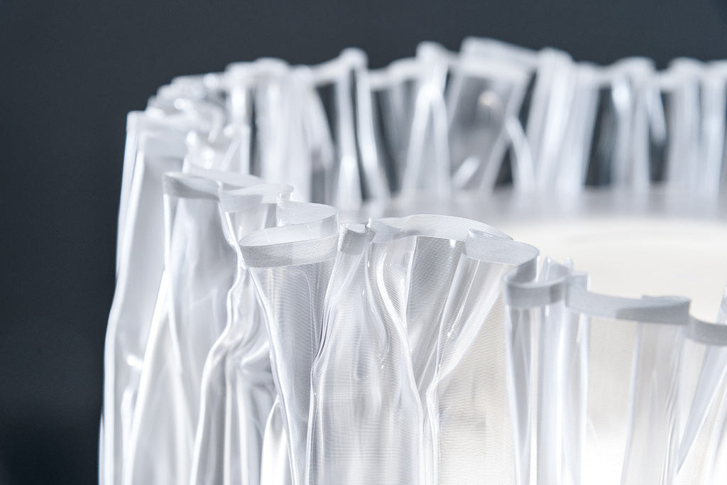 La collection Accordéon marque l’ouverture d’un nouveau fil narratif au design contemporain : le Lentiflex®, le matériau exclusif Slamp qui diffuse uniformément la lumière, il est chauffé et façonné à la main par les Couturierès de la Lumière pour créer de véritables pièces uniques, jamais parfaitement identique. Pour garantir l’unicité du design, le côté de la base est orné d’une fine barre en acier portant la mention « Handmade in Italy ». La structure interne et l’élément de fermeture supérieur de la lampe de table sont conçus pour s’adapter au mouvement du plissé et empêcher la réception de la poussière. La lampe a un double interrupteur, permettant d’allumer le diffuseur indépendamment ou en même temps que la base, qui s’allume uniformément, recréant la texture d’un tissu en coton. Le diffuseur et les supports de la lampe de table sont équipés d’une connexion magnétique pour faciliter le nettoyage et le remplacement des ampoules.