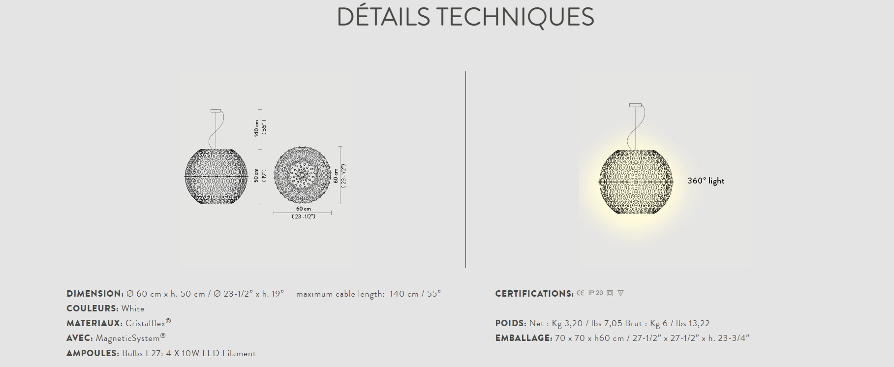 Dans sa version Globe, Charlotte recrée la trame laborieuse et reprend subtilement les traits d’un essaim d’abeilles à la forme sphérique accueillante et archétypale. Réalisée en Cristalflex® – avec une structure interne diffuse en Lentiflex® – et munie d’une attache magnétique, Charlotte Globe conserve la profondeur et la perspective des hexagones concentriques qui caractérisent cette collection signée par Doriana et Massimiliano Fuksas. Le câble électrique et le câble de suspension correspondent, accentuant le caractère éthéré de la lampe. Munie de 4 ampoules (intensité lumineuse et température chromatique sont réglables selon le choix des ampoules), Charlotte Globe a un diamètre de 60 cm pour remplir l’espace de sa délicate opulence. La collection comprend une lampe de terre, une applique et deux autres suspensions.