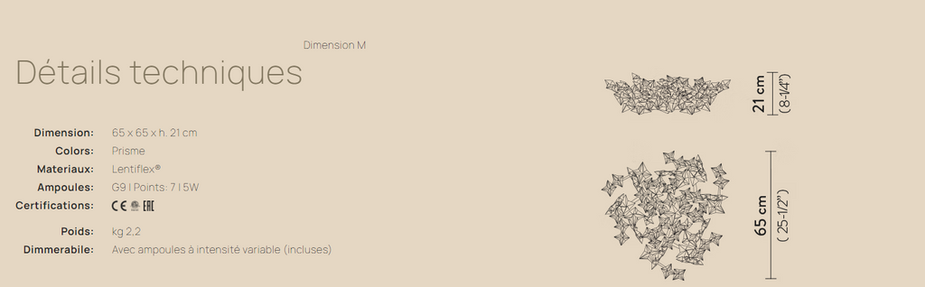 Les réfractions uniques et délicatement colorées de Hanami sont réparties dans des fleurs pliées à la main en Lentiflex®, un matériau luxueux qui recrée des reflets de type diamant, chacune montée sur un cadre en acier peint et polycarbonate avec des ampoules LED G9 à gradation fixe.