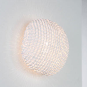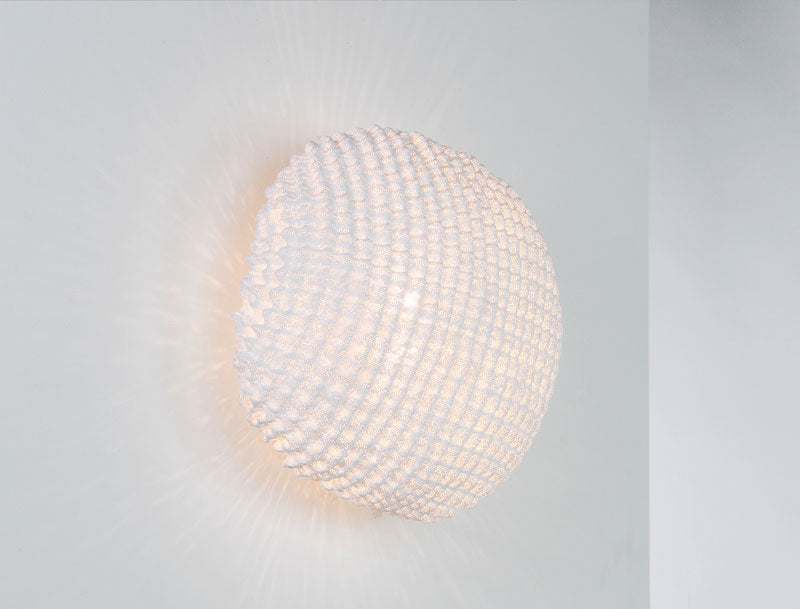 La texture est la qualité centrale de la grande applique murale d'inspiration organique de Tati, fabriquée à la main en maille d'acier inoxydable peinte. De petits cercles qui se répètent formant une coquille arrondie irrégulière, à travers laquelle filtre la lumière générant de belles nuances. Un micro-paysage de montagnes et de vallées, de lumières et d'ombres, qui s'harmonise dans n'importe quel modèle de la collection conçue par Arturo Álvarez.