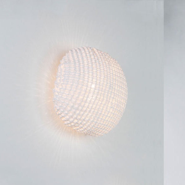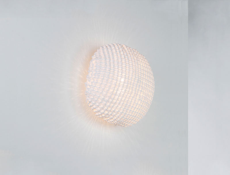 La texture est la qualité centrale de l'applique murale Tati medium, applique murale d'inspiration organique, fabriquée à la main en maille d'acier inoxydable peinte. De petits cercles qui se répètent formant une coquille arrondie irrégulière, à travers laquelle filtre la lumière générant de belles nuances. Un micro-paysage de montagnes et de vallées, de lumières et d'ombres, qui s'harmonise dans n'importe quel modèle de la collection conçue par Arturo Álvarez.
