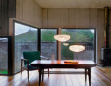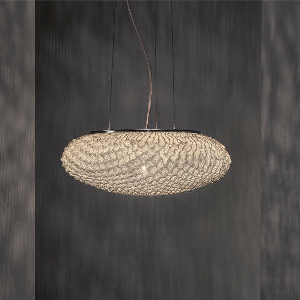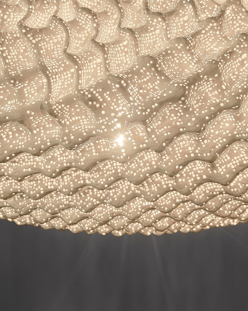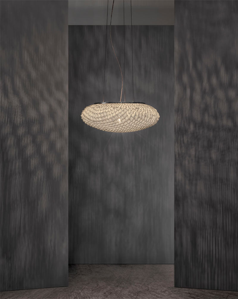 La texture est la qualité centrale de cette collection d'inspiration organique en maille d'acier inoxydable peinte conçue par Arturo Álvarez. De petits cercles qui se répètent formant une coquille arrondie irrégulière, à travers laquelle filtre la lumière générant de belles nuances. Un micro-paysage de montagnes et de vallées, de lumières et d'ombres, qui est harmonieux dans la petite suspension Tati