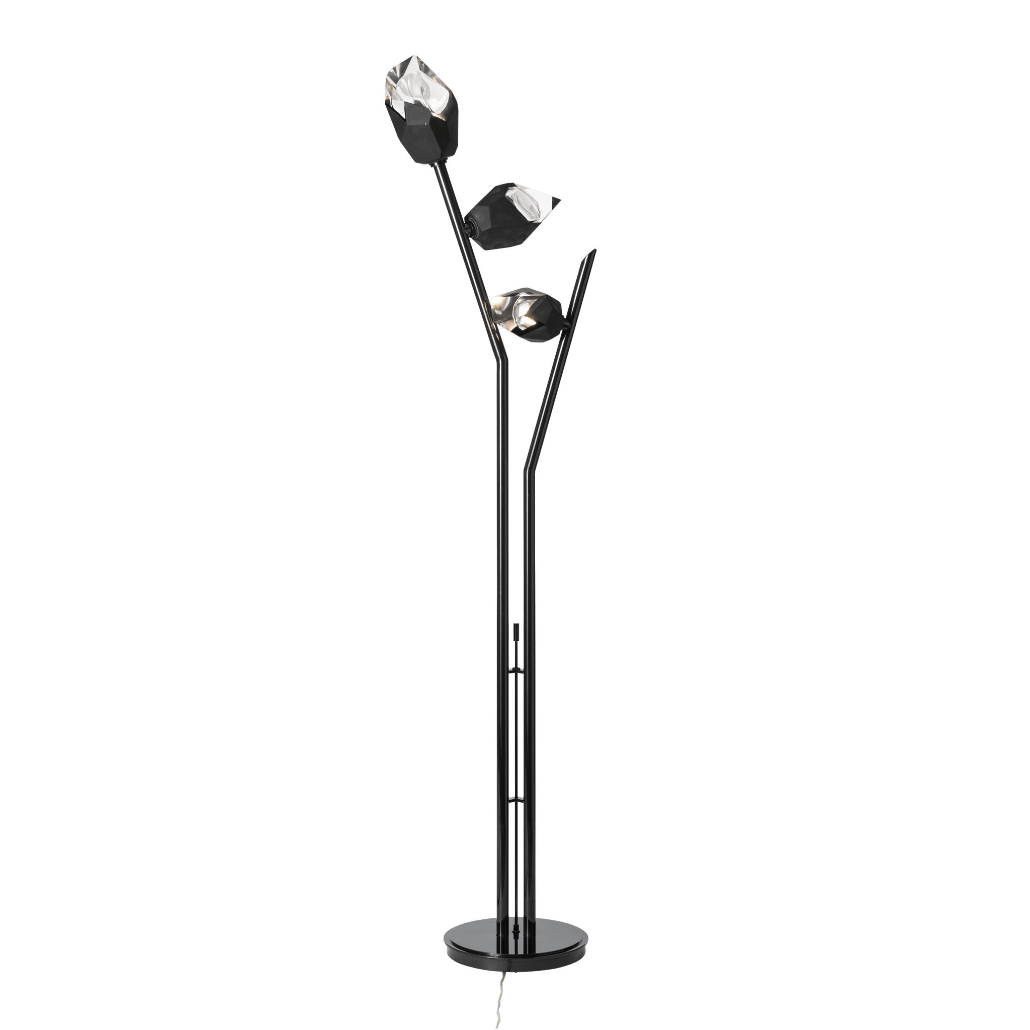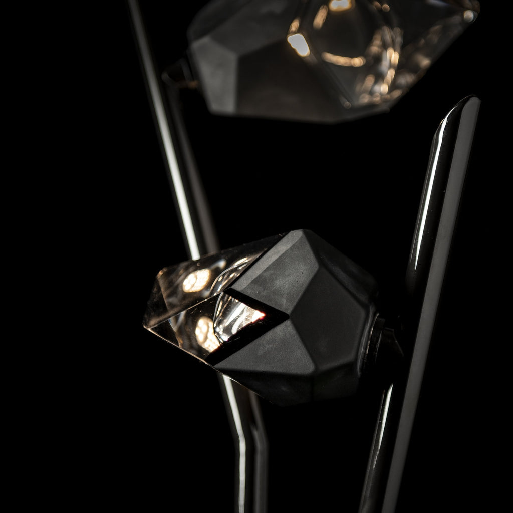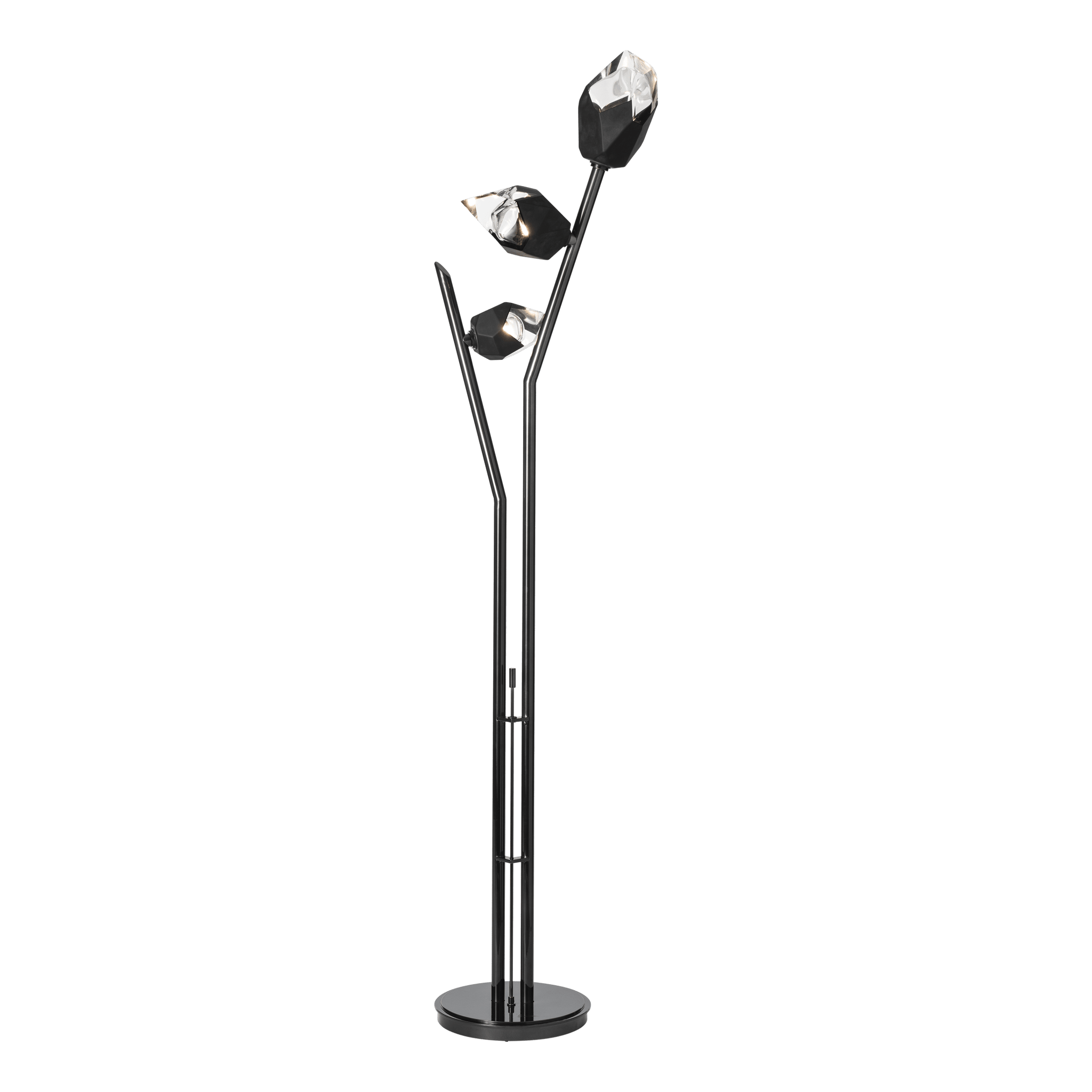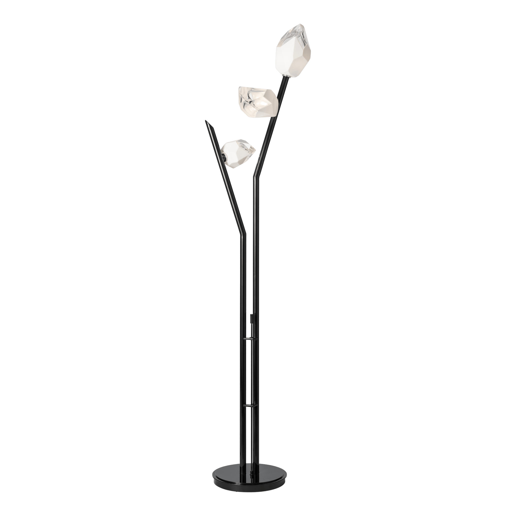 Chaque torche Chrysalis comprend trois pièces de verre soufflé exquises, créées à l'aide de techniques complexes de soufflage de verre. D’épaisses couches de verre sont soigneusement soufflées dans un moule, formant ainsi la forme initiale. Ensuite, avec précision et finesse, une partie de la couche externe de verre coloré (noir mat ou blanc mat) est retirée grâce à un meulage et un polissage astucieux des facettes, révélant l'éclat intérieur caché du verre transparent de son lampadaire sculptural.
