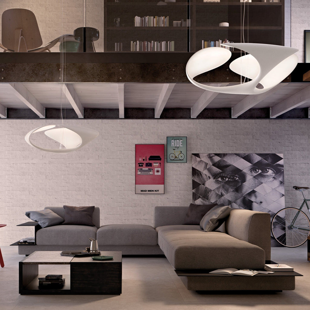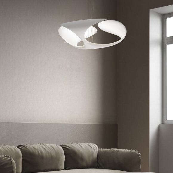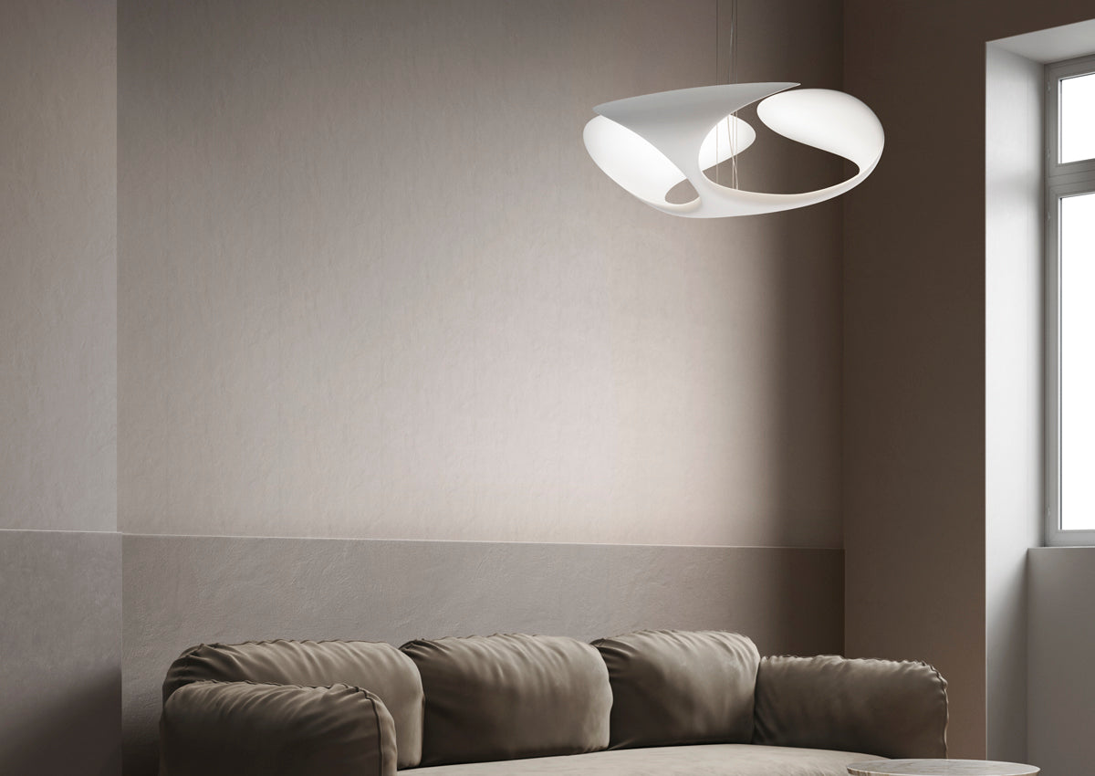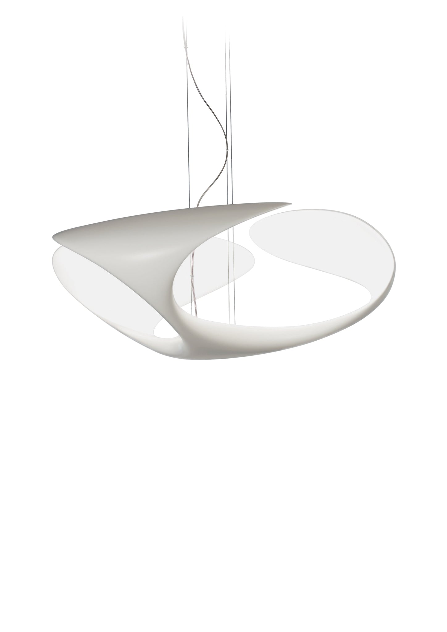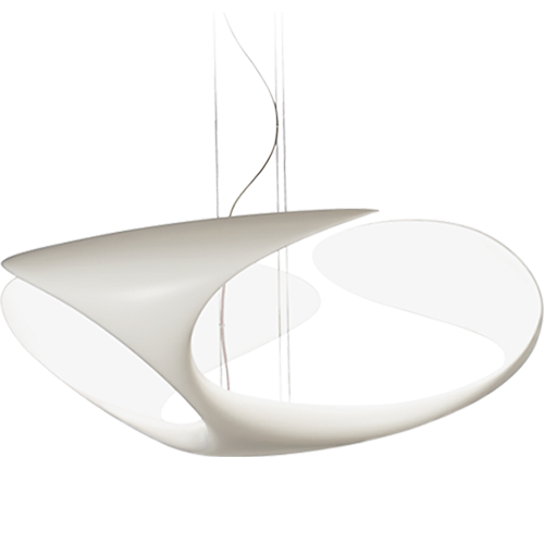 La structure tridimensionnelle particulière, enveloppante et ouverte, rappelle la forme naturelle d’un trèfle. Presque une sculpture de dimensions importantes, mais d’une extrême légèreté. La source lumineuse, insérée au point de rencontre des trois grands pétales, réfléchit la lumière sur les surfaces internes dans un jeu de renvois.