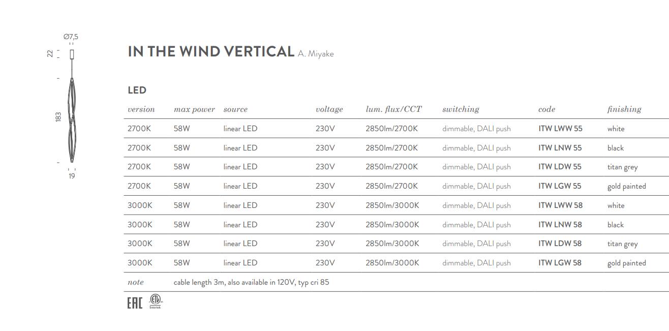 Suspensions pour un éclairage LED chaleureux et diffus. La structure est fabriquée grâce à une technologie de torsion et de désalignement de la barre en aluminium extrudé, expressément étudiée par Nemo. Il permet une émission LED à 360°. Les parties terminales sont en aluminium moulé sous pression. Les diffuseurs sont en méthacrylate opale. Les lampes sont disponibles en blanc mat, noir mat, gris titane et or mat.