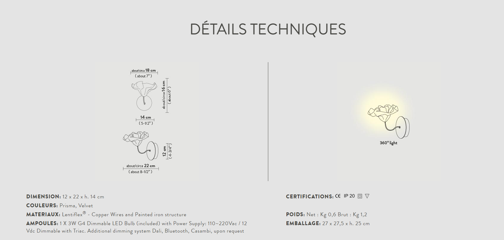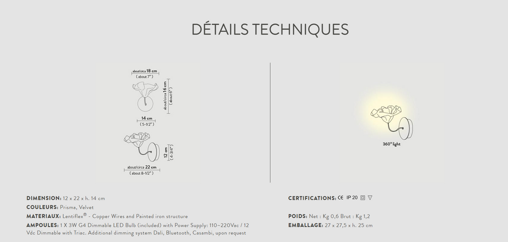 De la démarche de recherche de Marc Sadler sur les technopolymères Slamp est née Lafleur Applique, une applique issue du modelage manuel à chaud du Lentiflex®, le technopolymère exclusif, résistant et incassable de Slamp. La corolle, disponible dans les couleurs Prisma ou Velvet, est reliée à la structure opaque, respectivement blanche ou noire, au moyen d’une tige de cuivre tressée qui lui donne l’inclinaison parfaite et une saveur poétique. La source lumineuse LED G4 remplaçable est logée dans la corolle centrale pour créer une lumière douce et variable. Une solution d’éclairage parfaite en multiples pour les environnements tels que les entrées et les couloirs, idéale sur les côtés du lit pour remplacer les abat-jour.