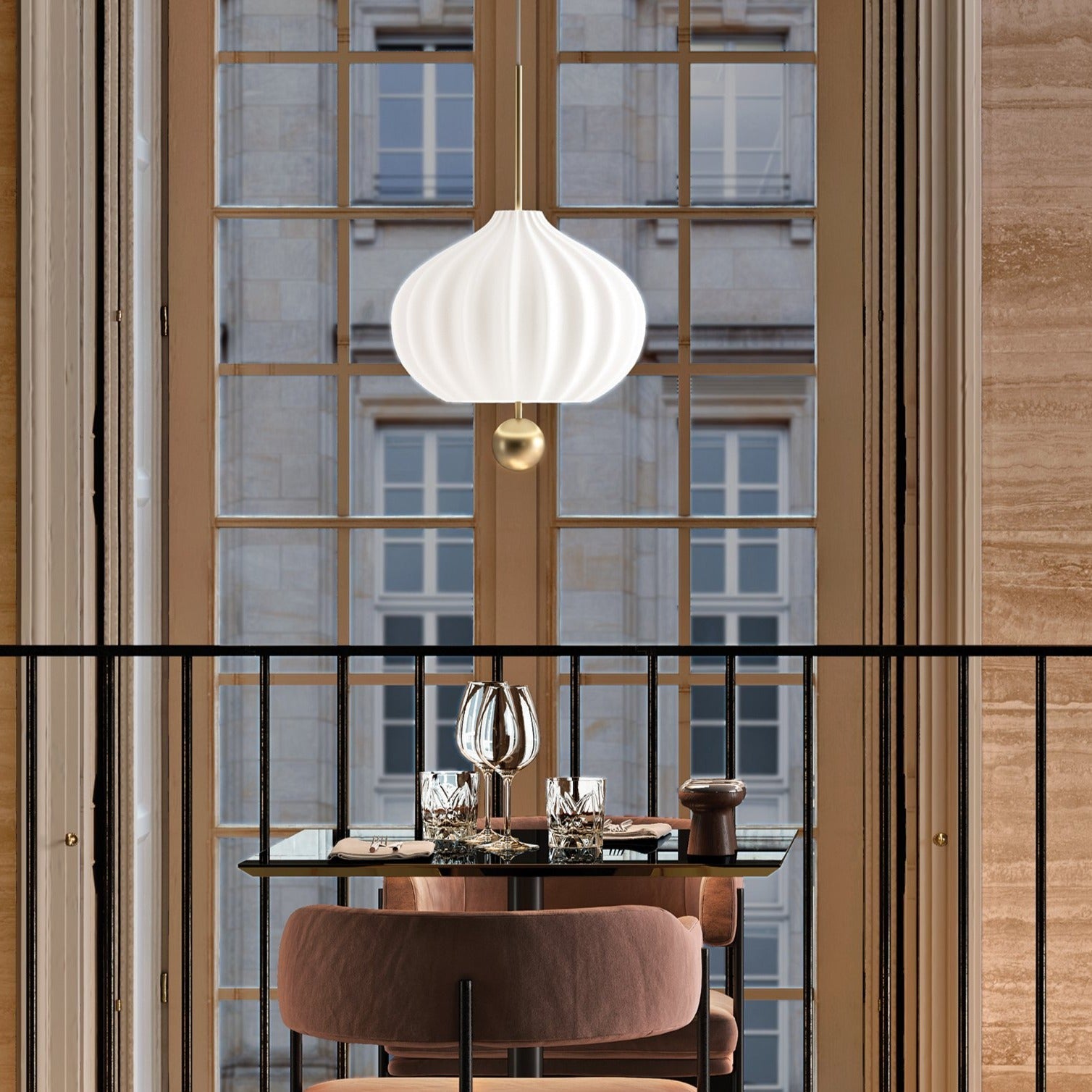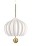 Lampe à suspension. Diffuseur en verre opalin soufflé double couche. Structure en laiton satiné.