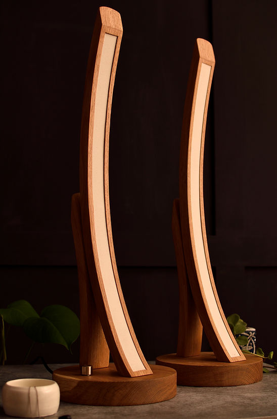 Élégantes et élancées, vous serez charmé par ces deux lampes de table conçues par l'Atelier Atypique. Le gradateur ajuste l'intensité lumineuse pour supporter toutes les ambiances possibles dans votre chambre ou votre bureau, accentuant les courbes délicates du chêne.