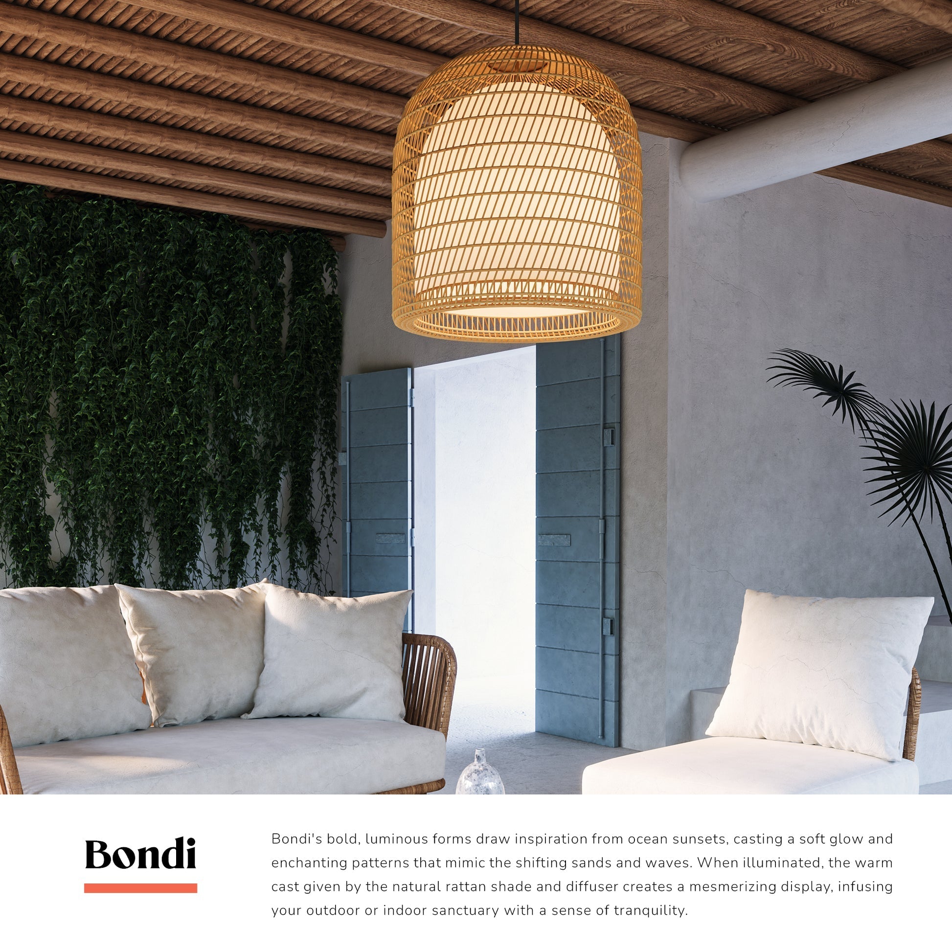 Les formes audacieuses et lumineuses de Bondi s'inspirent des couchers de soleil sur l'océan, projetant une douce lueur et des motifs enchanteurs imitant le mouvement du sable et des vagues. Une fois illuminée, la douce lumière de l'abat-jour et du diffuseur en rotin naturel crée un spectacle envoûtant, imprégnant votre espace extérieur ou intérieur d'une atmosphère de sérénité.