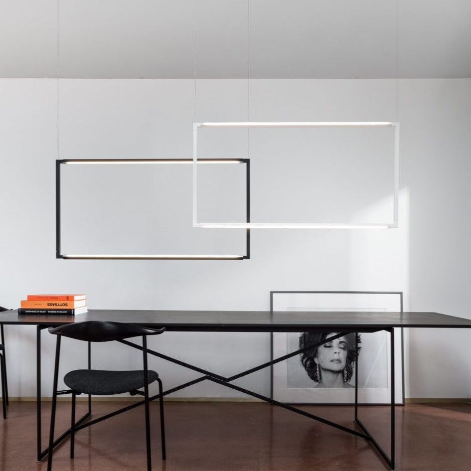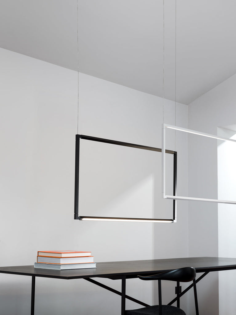 Lampadaires, appliques/plafonniers, suspensions et lampes de table basées sur une structure en aluminium extrudé et tubulaire, reliées par des joints en polymère moulé, avec une finition peinte en blanc ou noir. Grâce aux joints, permettant aux profilés de loger des sources LED, on peut pivoter à 360° afin de produire un éclairage directionnel direct ou indirect, masqué par un diffuseur opalin en polycarbonate. La version au sol est conçue comme telle pour fournir une séparation virtuelle des ambiances, tandis que les versions au plafond et au mur permettent d'éclairer l'ambiance de manière polyvalente et confortable. Les sources LED sont dimmables.
