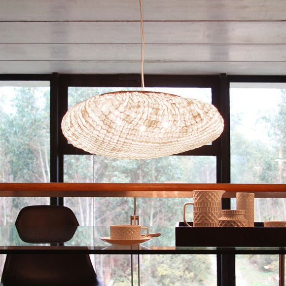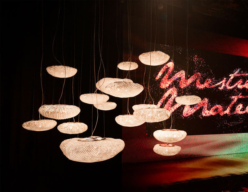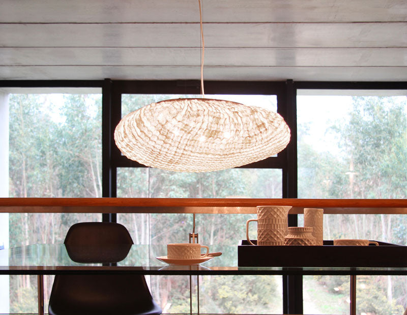La texture est la qualité centrale de cette collection d'inspiration organique en maille d'acier inoxydable peinte conçue par Arturo Álvarez. De petits cercles qui se répètent formant une coquille arrondie irrégulière, à travers laquelle filtre la lumière générant de belles nuances. Un micro-paysage de montagnes et de vallées, de lumières et d'ombres, qui s'harmonise dans tous ses modèles et dimensions, de la grande suspension Tati à ses versions de table ou murales.